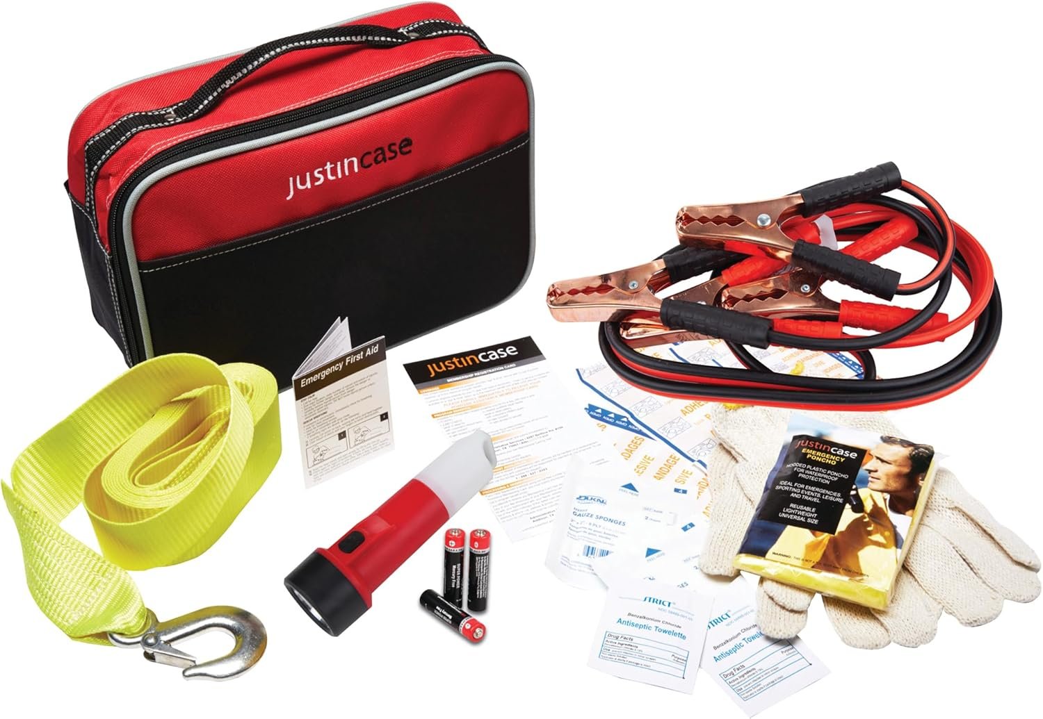 Travel Pro Auto Safety Kits for Vehicles: Includes a wide selection of emergency preparedness items: an 8′ 10-gauge portable jumper cable, a tow strap, a flashlight with batteries, and knit gloves.