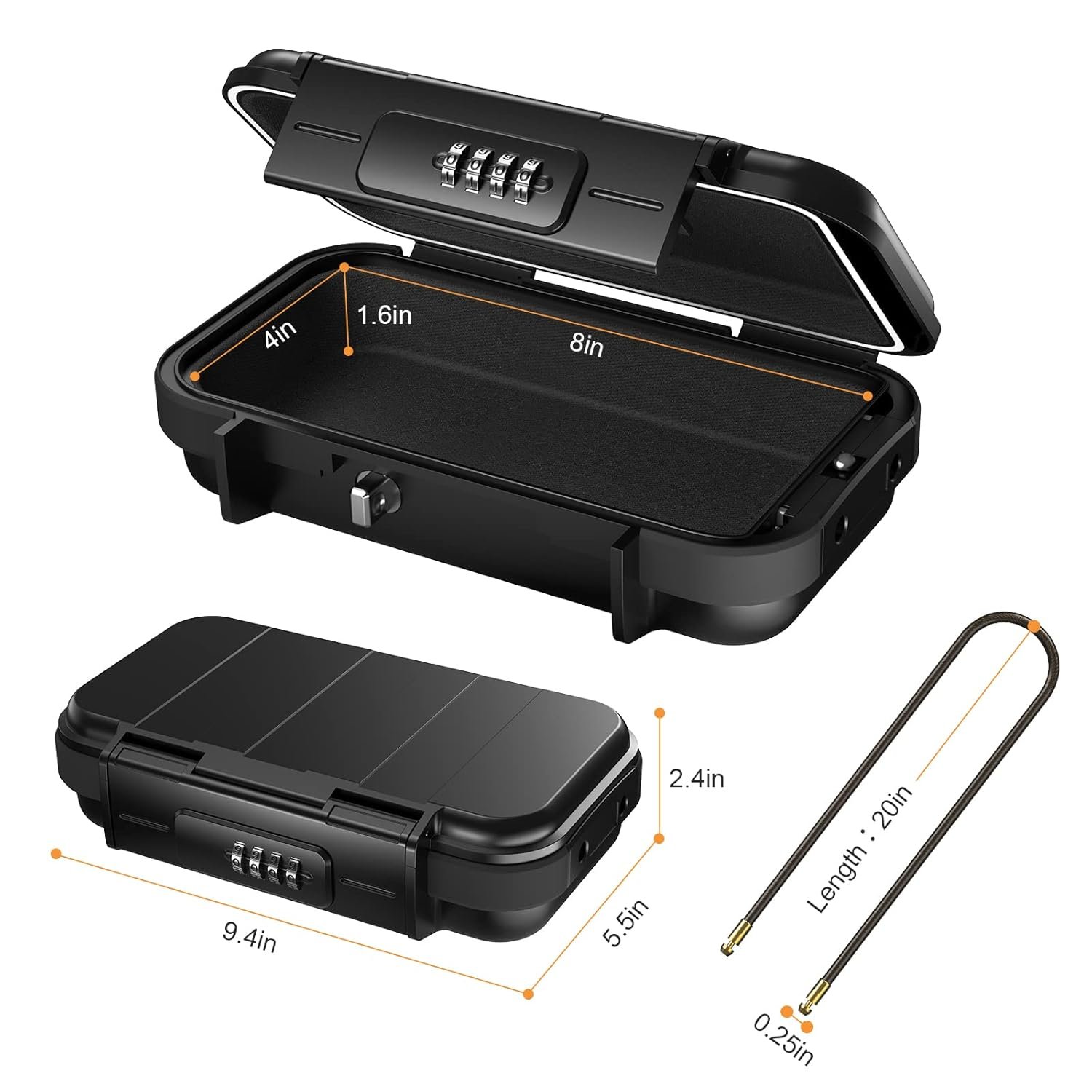 Portable Safe Box: Exterior Size: 9.5 inch(L) x 5.5 inch(W) x 2.4 inch(H). Interior Size: 8 inch(L) x 4 inch(W) x 1.6 inch(H). Its perfect size allows it to be easily put into your backpack and luggage and it is a good helper while you are on Beaches and Outdoors activities, travel or business trip.