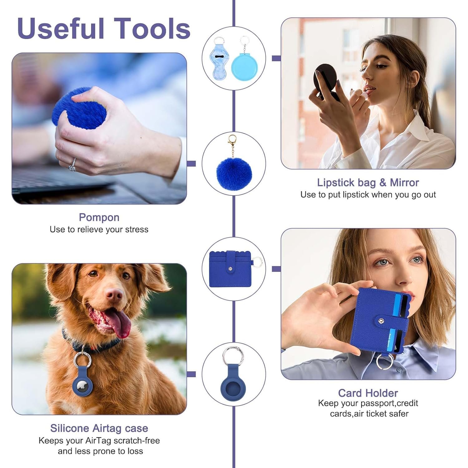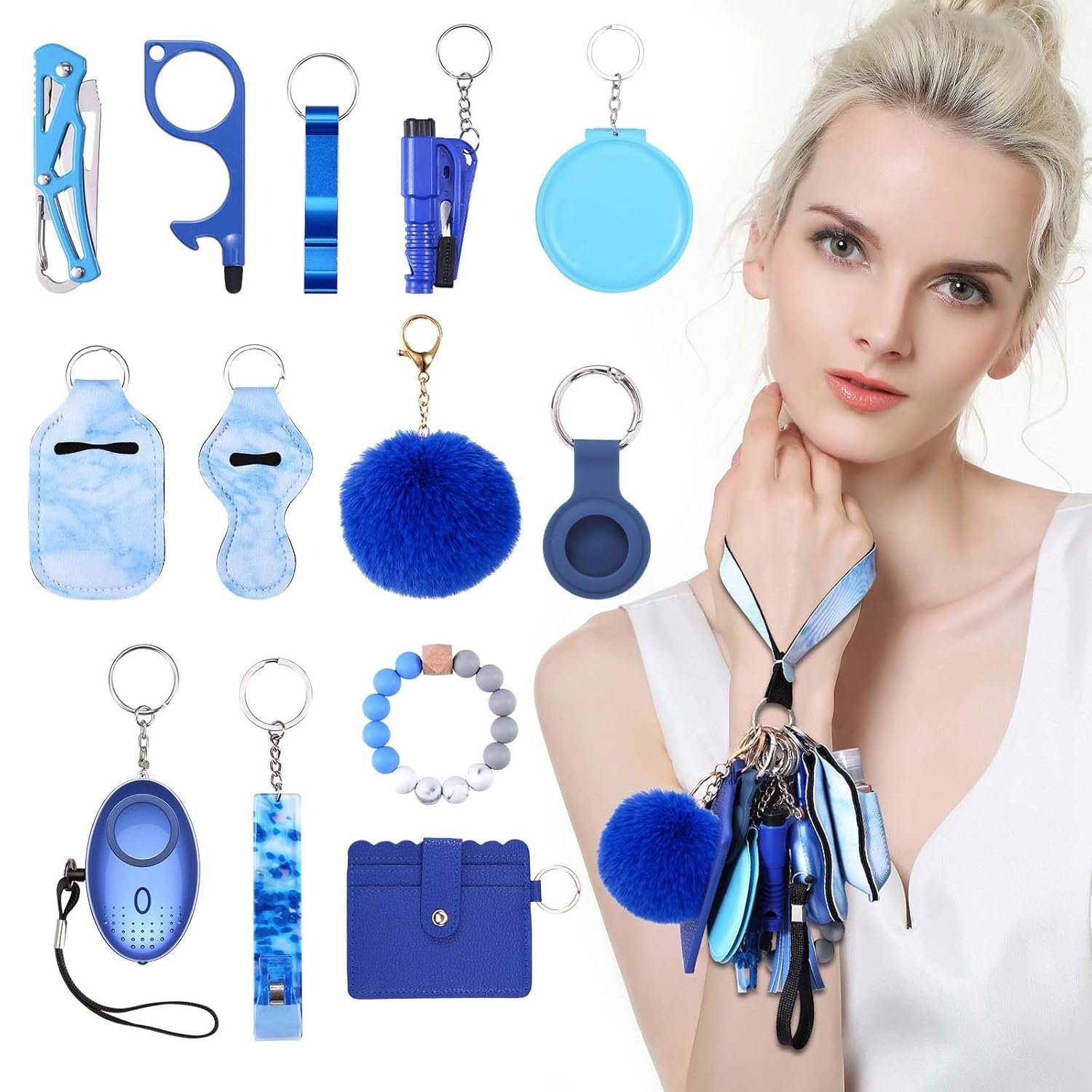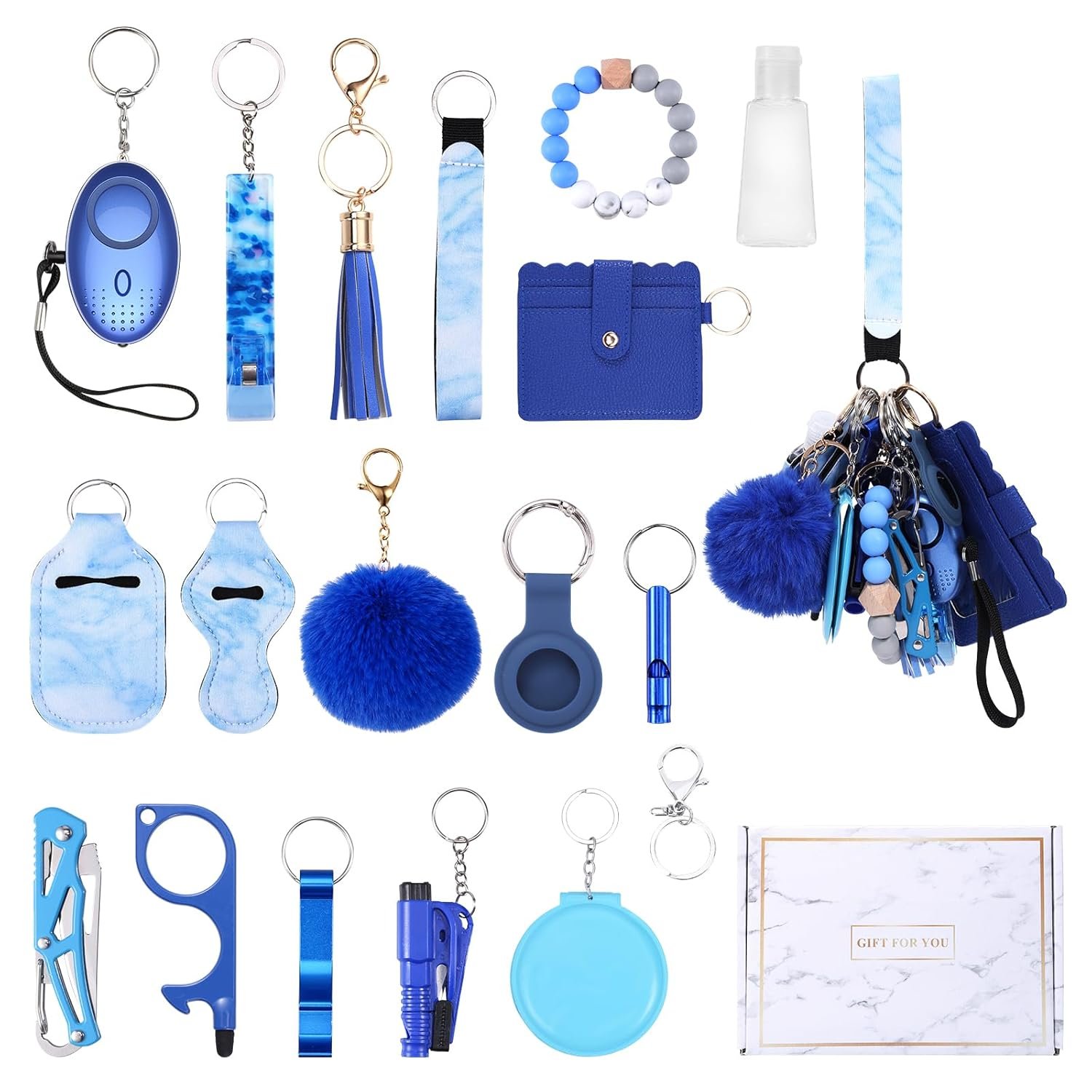 Safety Keychain Set – This keychain gift set includes essential tools like a whistle (110dB), a window breaker, and a Personal Alarm, providing reliable protection in unexpected situations. It also includes beaded bracelet, card holder, no-touch door opener, tassel, pom-pom, empty bottle and more. Lightweight and portable, this safety keychain set can easily attach to any bag.
