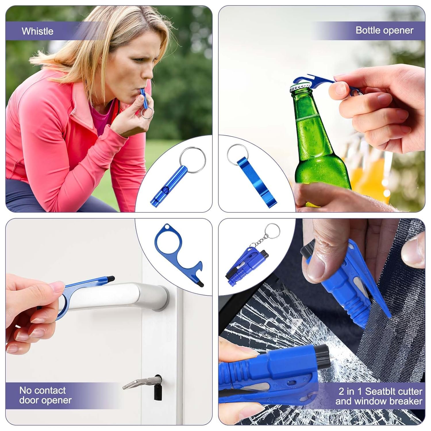 This keychain set includes a variety of safety tools like a personal alarm, window breaker, and whistle, making it a perfect companion for students, women, elderly, and outdoor enthusiasts.