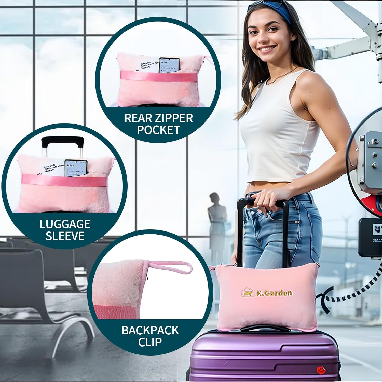 K.Garden Travel Cooling Blanket and Pillow- Soft 2 in 1 Airplane Compact Flight Essentials Car Pillow Travelers Gifts Accessories Compact Pack Blanket for Any Travel with Luggage Backpack Strap,Pink