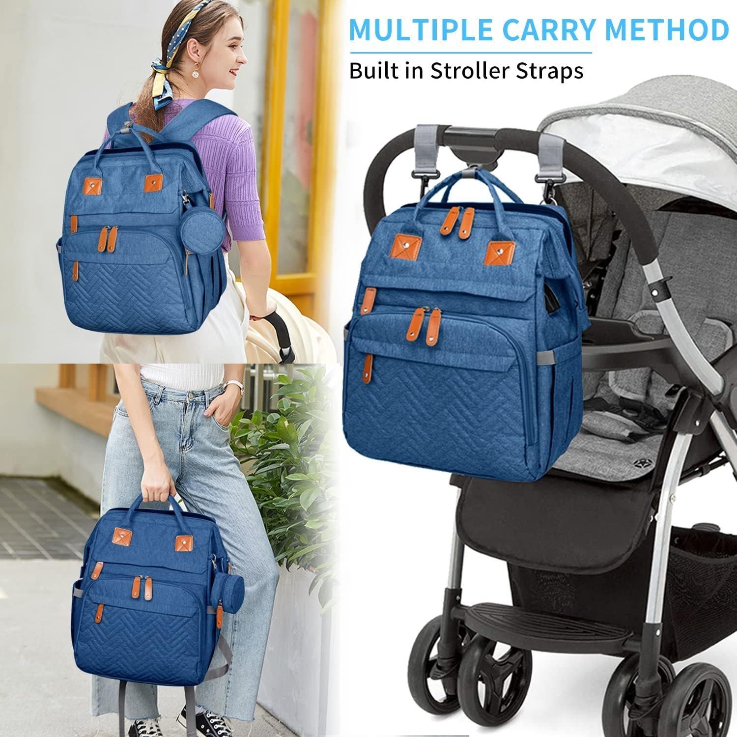 CONVERTIBLE & MULTI-PURPOSE: Stylish and unisex design makes our nappy bag a nice choice for both women and men; This diaper bag can be used as a backpack, handbag, and tote; It also can be hanged on the stroller using the included stroller straps; Elegant and suitable for many occasions like shopping, picnics or traveling (Airport-Friendly Packed Size)