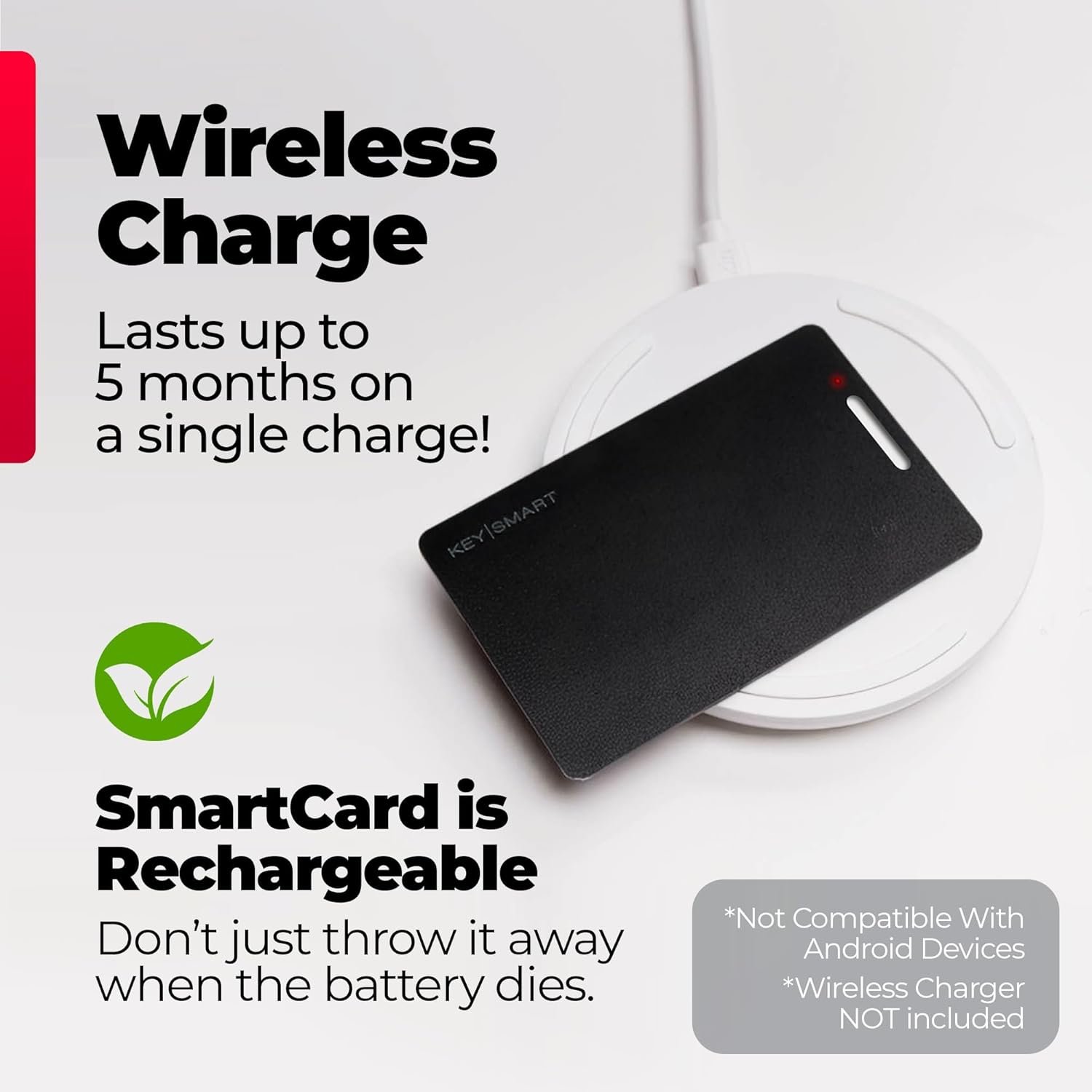 Wireless Charging with up to 5 months of Battery: No special charging cable required. Reusable and built to last. The KeySmart Card lasts up to 5 months on a single charge, so you don’t have to worry about recharging it every week. Wireless Charger is sold separately and not included.