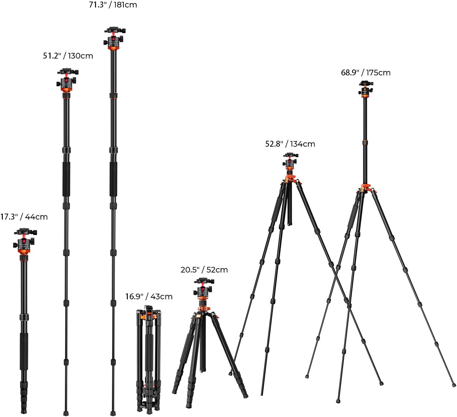 K&F Concept 68 inch /175cm Camera Tripods,Compact Travel Tripod with Monopod,10kg/22lbs Load Capacity 360° Panorama Ball Head Compatible with DSLR Cameras K255A4+BH-28L (TM2515M1)