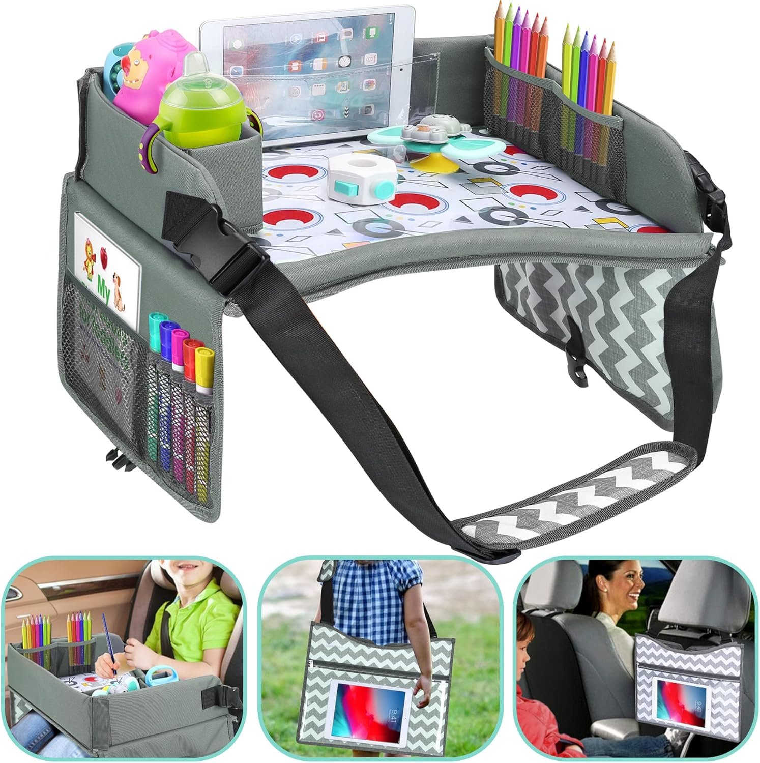 Kids Travel Tray – Car Seat Tray or Table as Road Trip Essentials – Children Kids Lap Desk as Travel Accessories for Toddler Airplane Travel Activity, Snack with Storage Pockets & Dry Erase Board