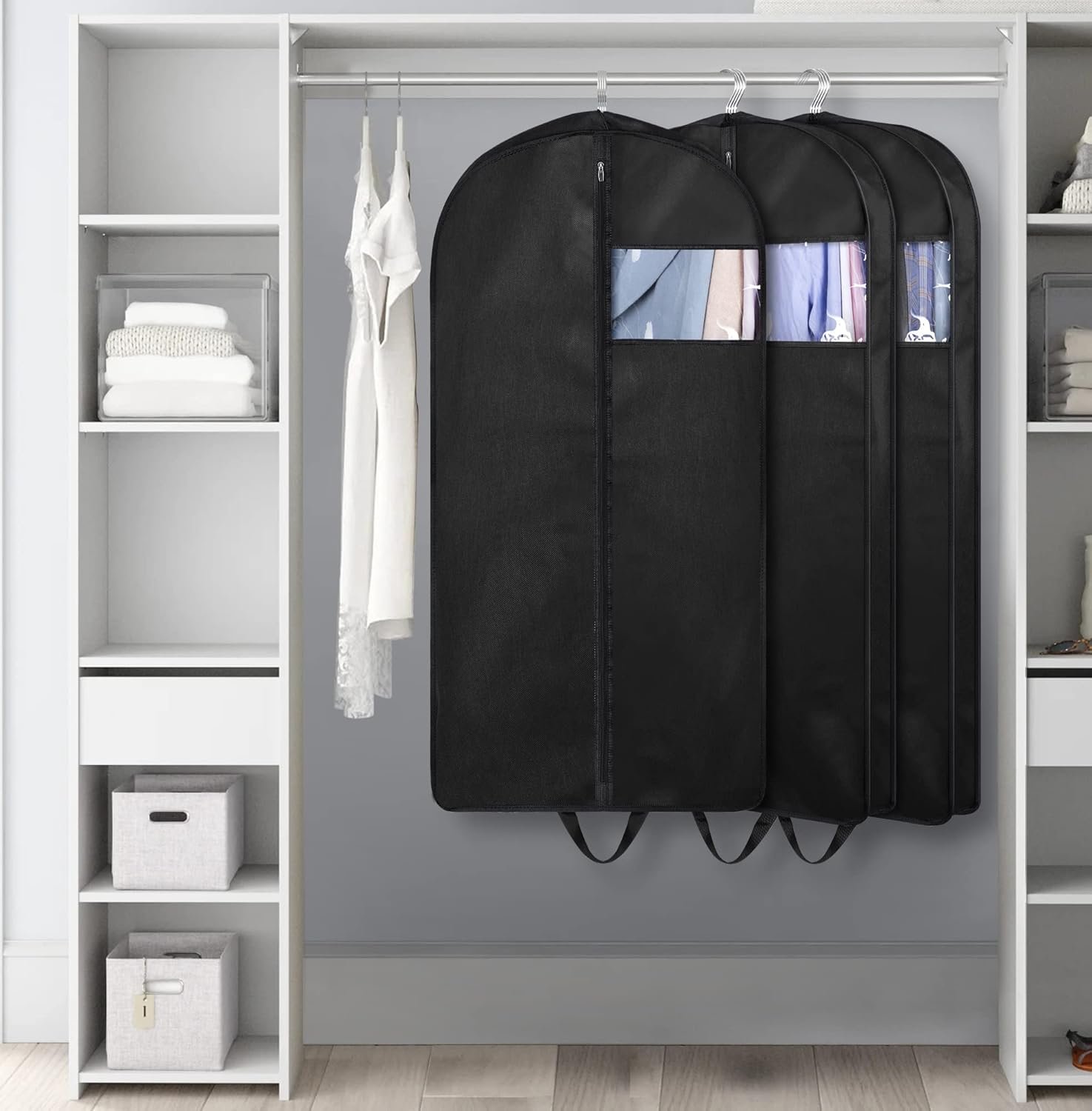 Roomy Capacity: Set of 3 garment bags for storage, each hanging clothes bag has 4″ gussets to store about 4pcs suits or 8pcs shirts, 3 packs can total hold up to 12pcs jackets or 9pcs winter coat;