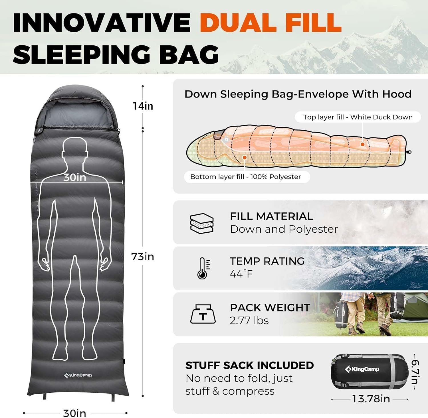 KingCamp Down Sleeping Bag for Adults, 600/700FP Cold Weather 3-4 Season Sleeping Bag, Ultralight & Compact with Compression Sack for Backpacking, Camping, Hiking