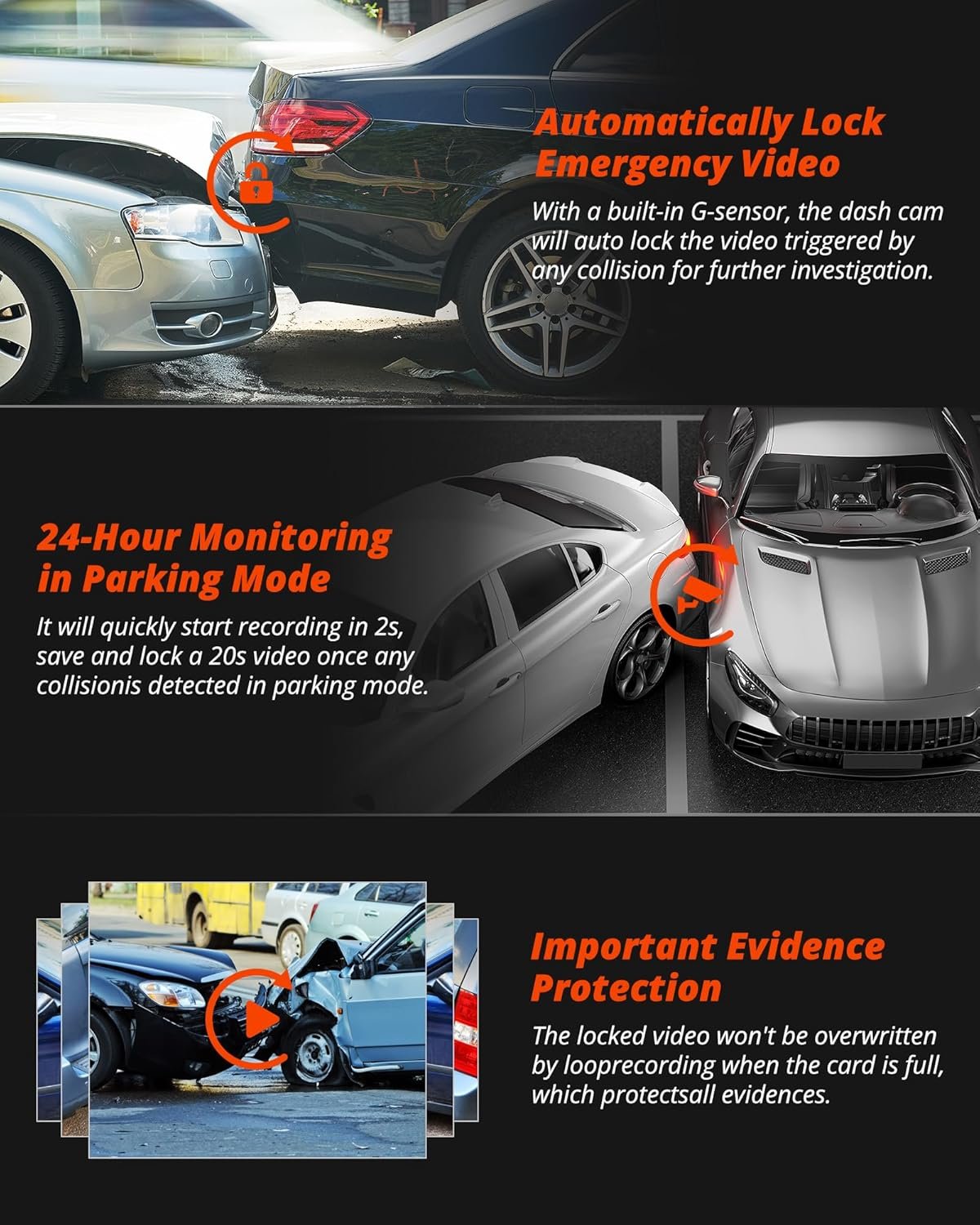 Superior Night Vision – Featured with advanced night vision technology that allows this dash cam to capture clear and detailed video footage in low-light conditions. This technology combines software algorithms and hardware components, including 4 infrared lights and a high-quality lens, to produce images and videos even in complete darkness.