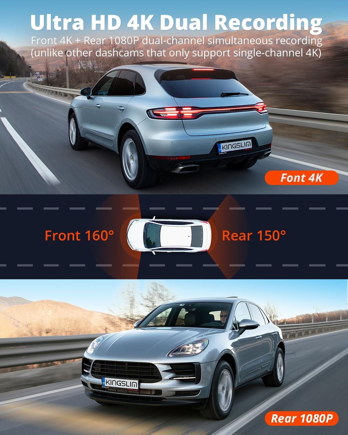 4K+1080P FRONT REAR : Car dash cam simultaneously captures the road in detail at 4K (front cam) and 1080P (rear cam)resolution. 160° front and 150° rear lens, clear and wide footage can be captured to ensure every angle is covered and nothing is missed
