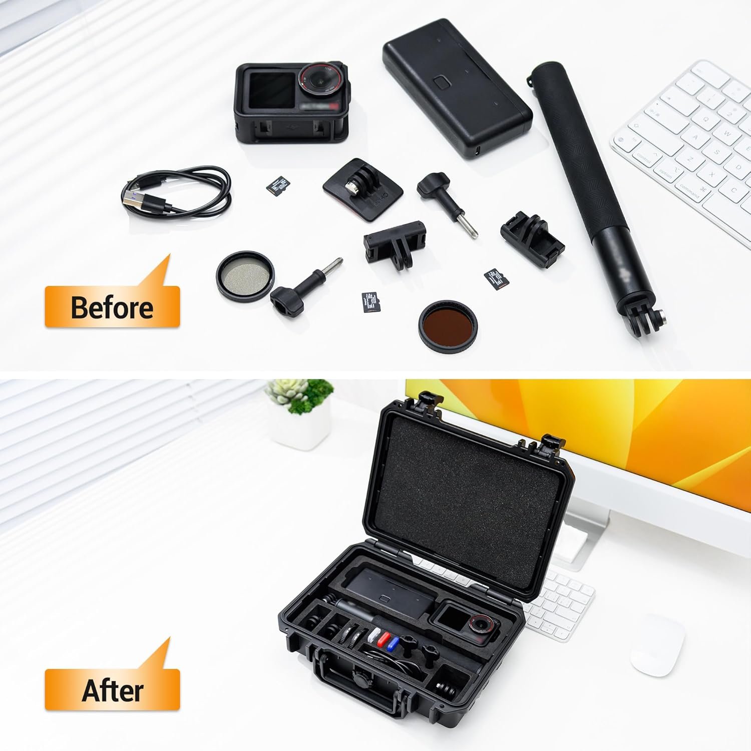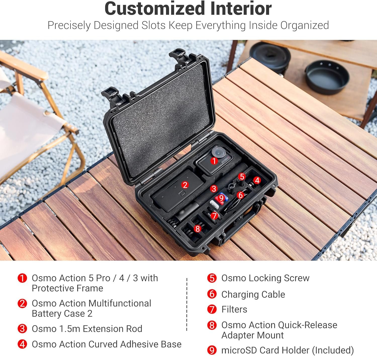 [Large Capacity] Lightweight and portable Storage for 1x Osmo Action 5 Pro / 4 / 3 &Protective Cover,1x Osmo Action battery case, 1x Osmo Action Battery Handle1.5m extension rod,1x Osmo Action curved adhesive base, locking screw, ND Filters, Filters, quick release adapter mount, Type-C Cable, 3×MicroSD Card Holder(included). 12-month Warranty.