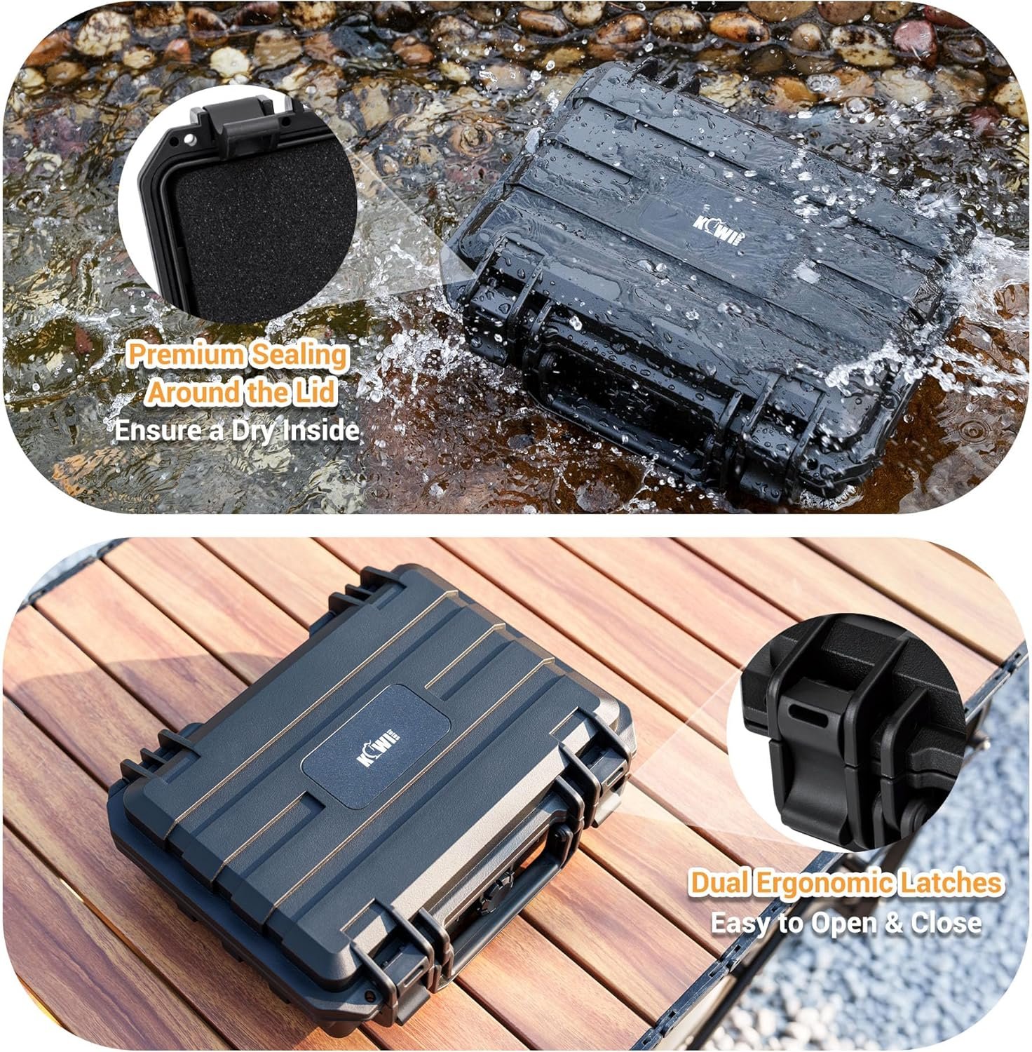 KIWIFOTOS Pocket 3 Protective Case is Anti-Impact, IP67 waterproof, moisture-proof and dust-proof. Can Protect Pocket 3 Camcorder in Harsh Environmental Conditions. great for Outdoor travel photography, Hiking, camping, Skiing Vlog Video Shooting. The case is equipped with a dual latches design, featuring an attachment hole on the latches for locking, enhanced safety, and security.