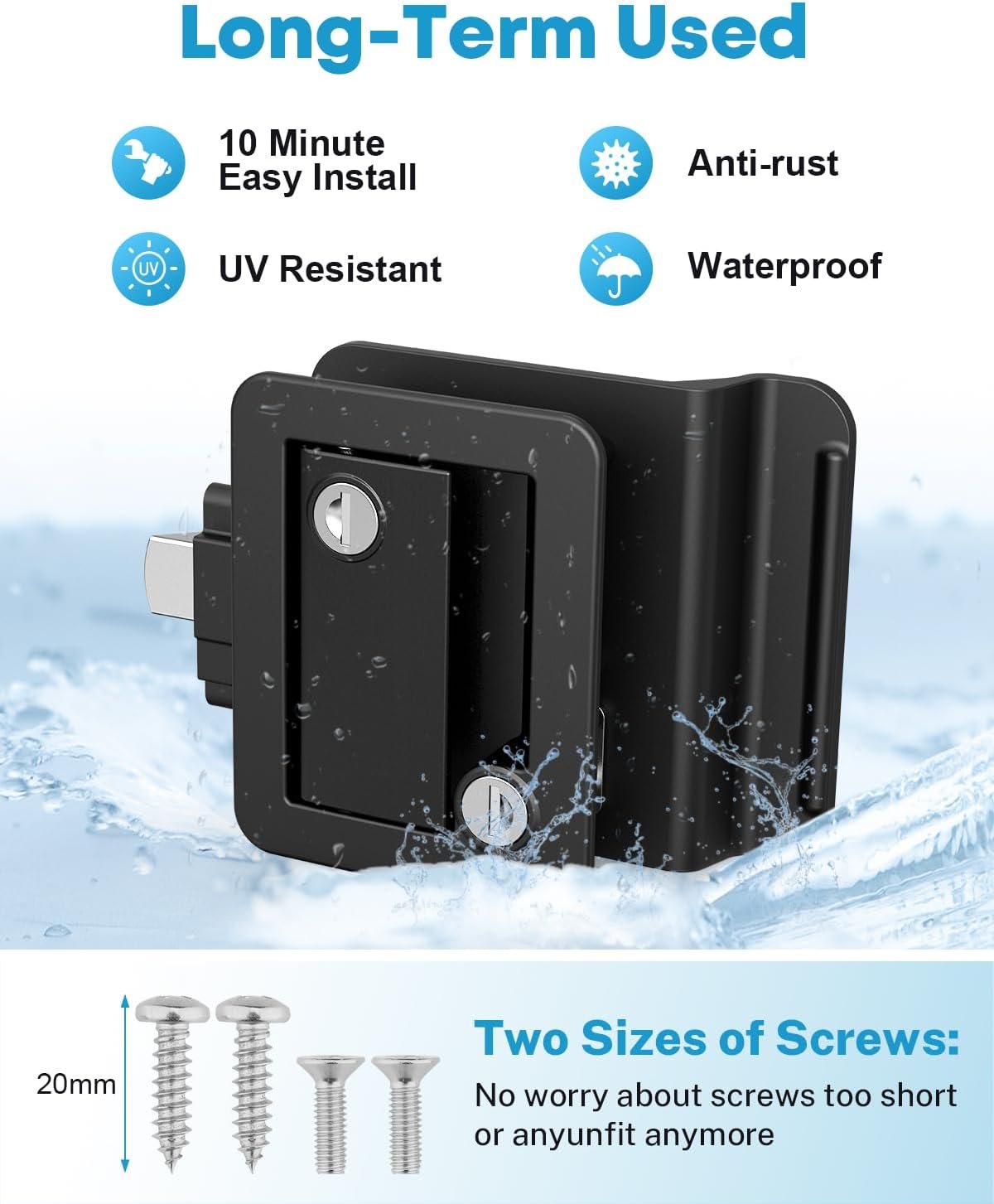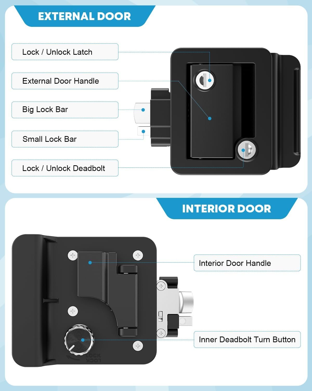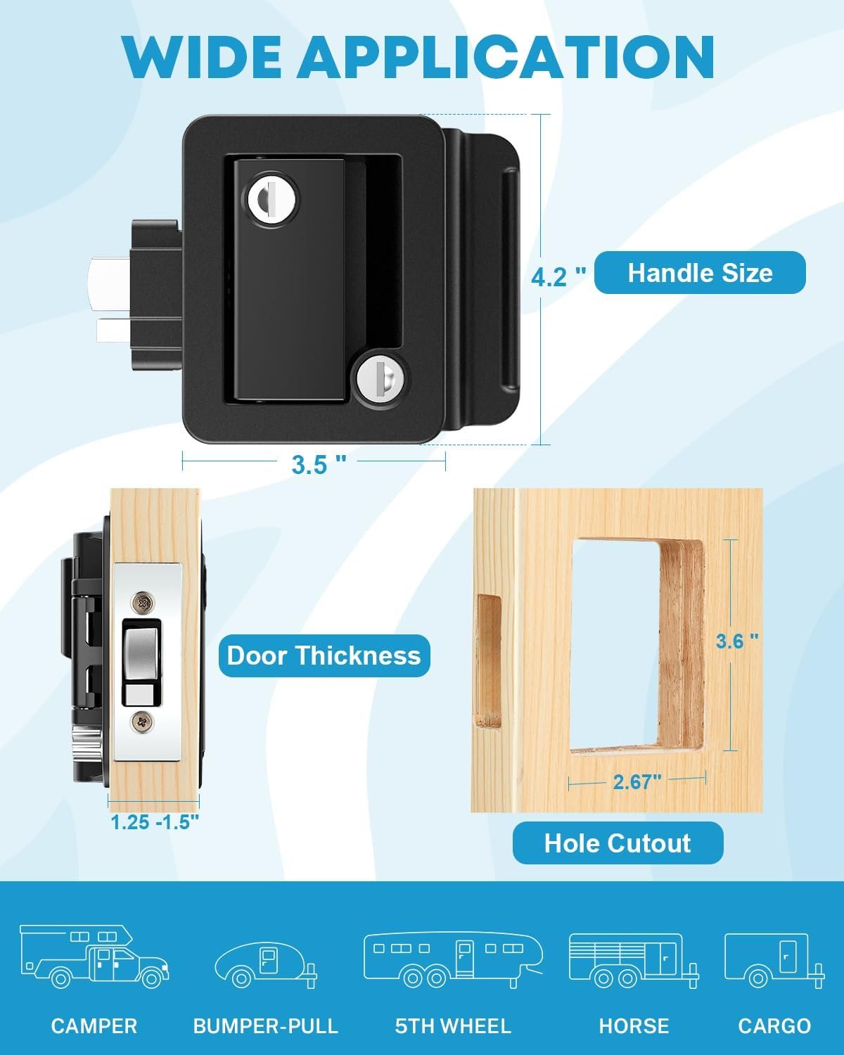 【DURABLE FOR OUTDOOR USING】The rest of the camper door lock components are made of Engineering Plastic, light-weight, rust and corrosion prevention, can withstand 250-390℉ high temperature, with better impact resistance, durability for long-term outdoor use.