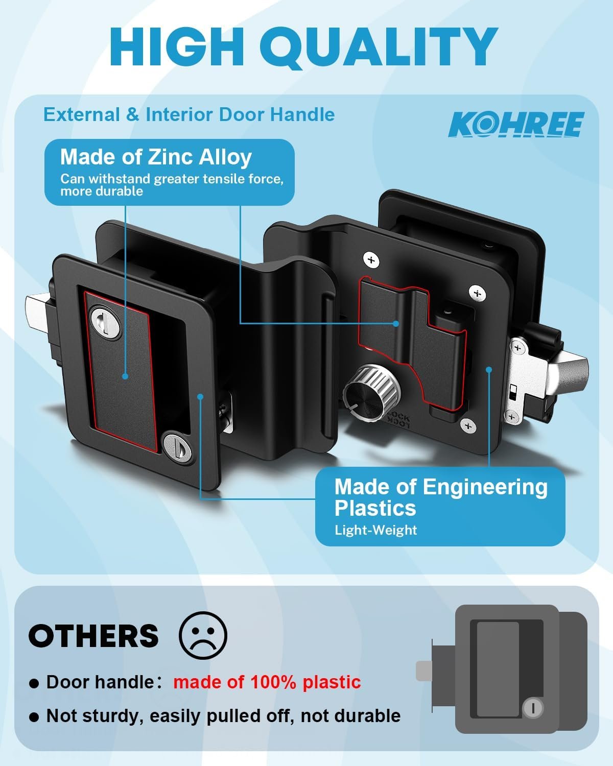 【PREMIUM & DURABLE】Upgraded Kohree RV door lock utilizes an original design of Zinc Alloy + Engineering Plastic + IPX3 waterproof material. External & Interior door handle are made of Zinc Alloy, featuring high hardness which can withstand greater tensile force and more durable than pure plastic construction.