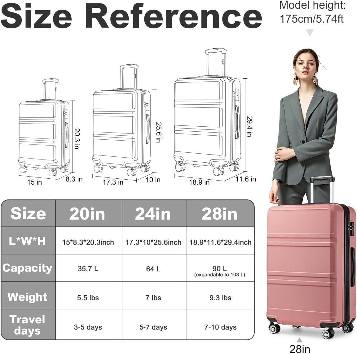 【28 INCH SPINNER LUGGAGE DIMENSIONS】Overall: 29.4″ x 18.9″ x 11.6″. Packing: 27.8″ x 17.7″ x 11.2″. Weight: 9.3 lbs. CAPACITY: 90L(+15%). Kono lightweight expandable 28″ suitcase with spinner wheels maximizes your packing power and is the ideal checked bag for longer trips. Perfect for 7-10 days trips!