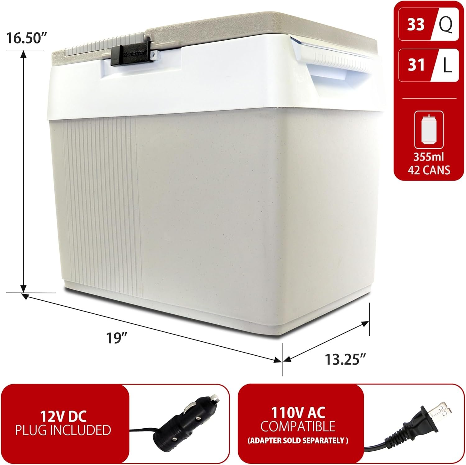 31 L (33 qt) Portable Cooler: 31 liter (33 quart) capacity means this 12V powered cooler/warmer has plenty of space for all your needs with room for up to 42 standard soft drink cans