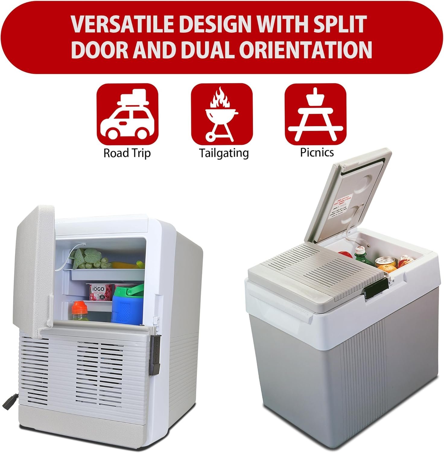 Versatile Two-Way Design: Secure sliding door lock and removable shelves let you use it either as a ice chest-style cooler or upright as a portable mini-fridge; unique split lid allows access to contents even in a tightly packed vehicle