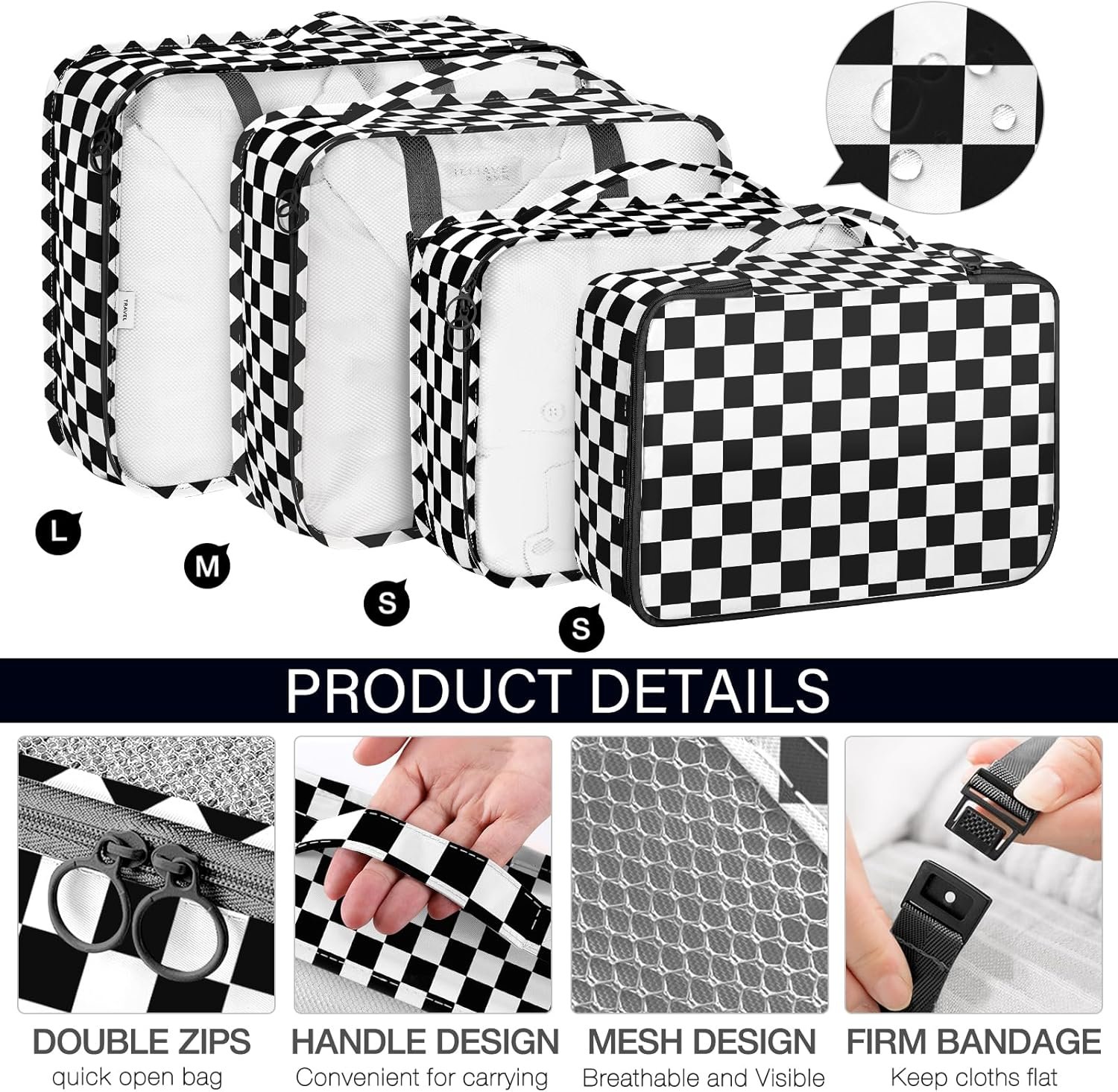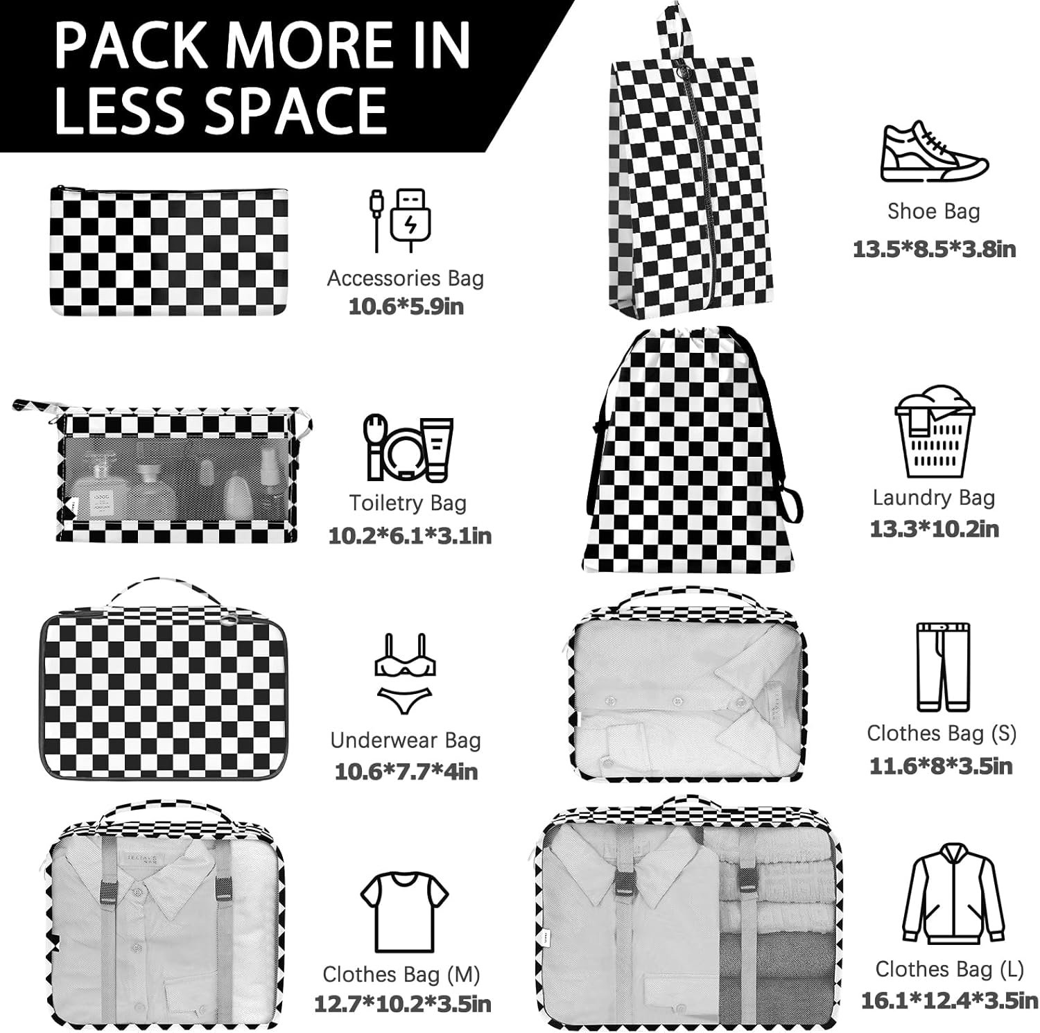 KPX 8 Set Packing Cubes for Travel, Luggage Packing Organizers Accessories Large Toiletries Bag for Clothes Shoes Cosmetics (8Set-Black Checkered)