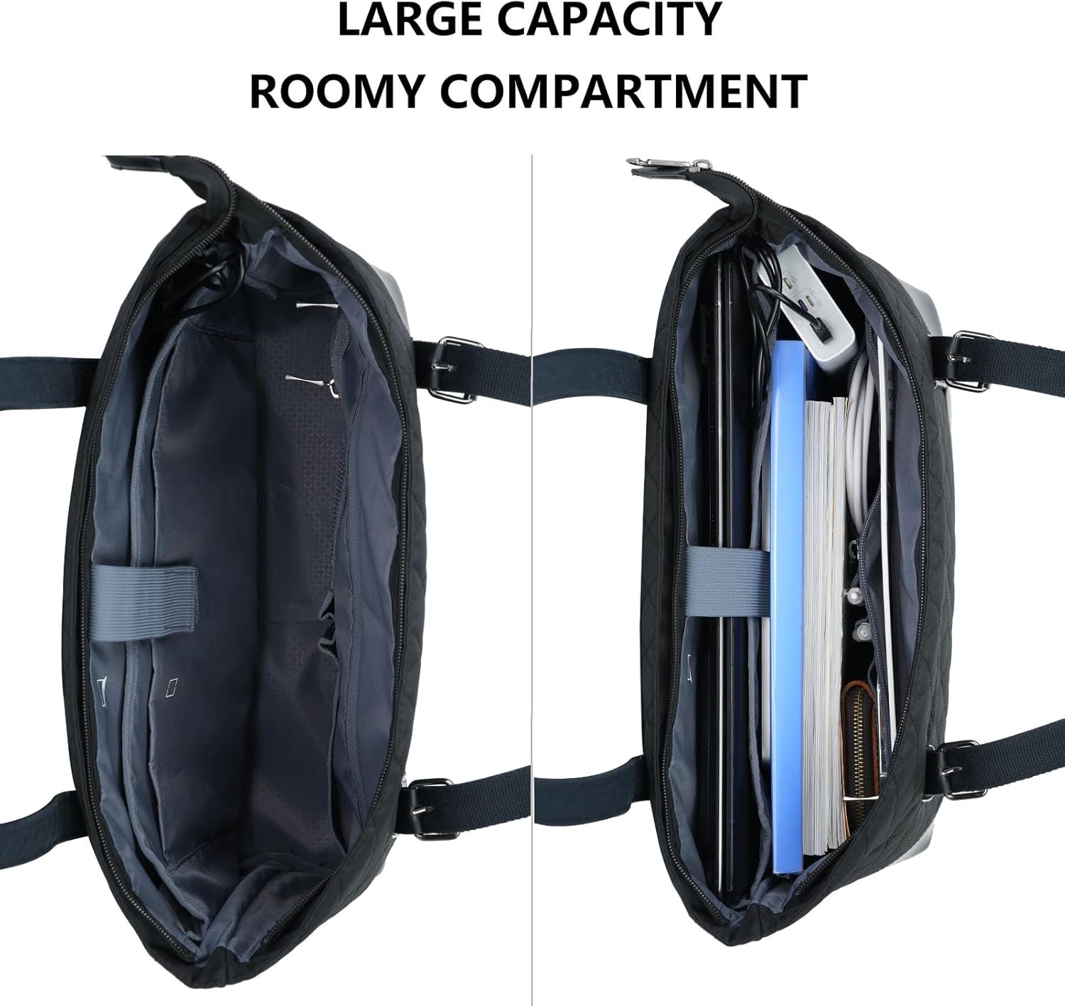 The tote bag has different pockets to meet your various needs. You can place your 14″-15.6″ laptop, ipad, accessories, cards, wallet in their right position easily.