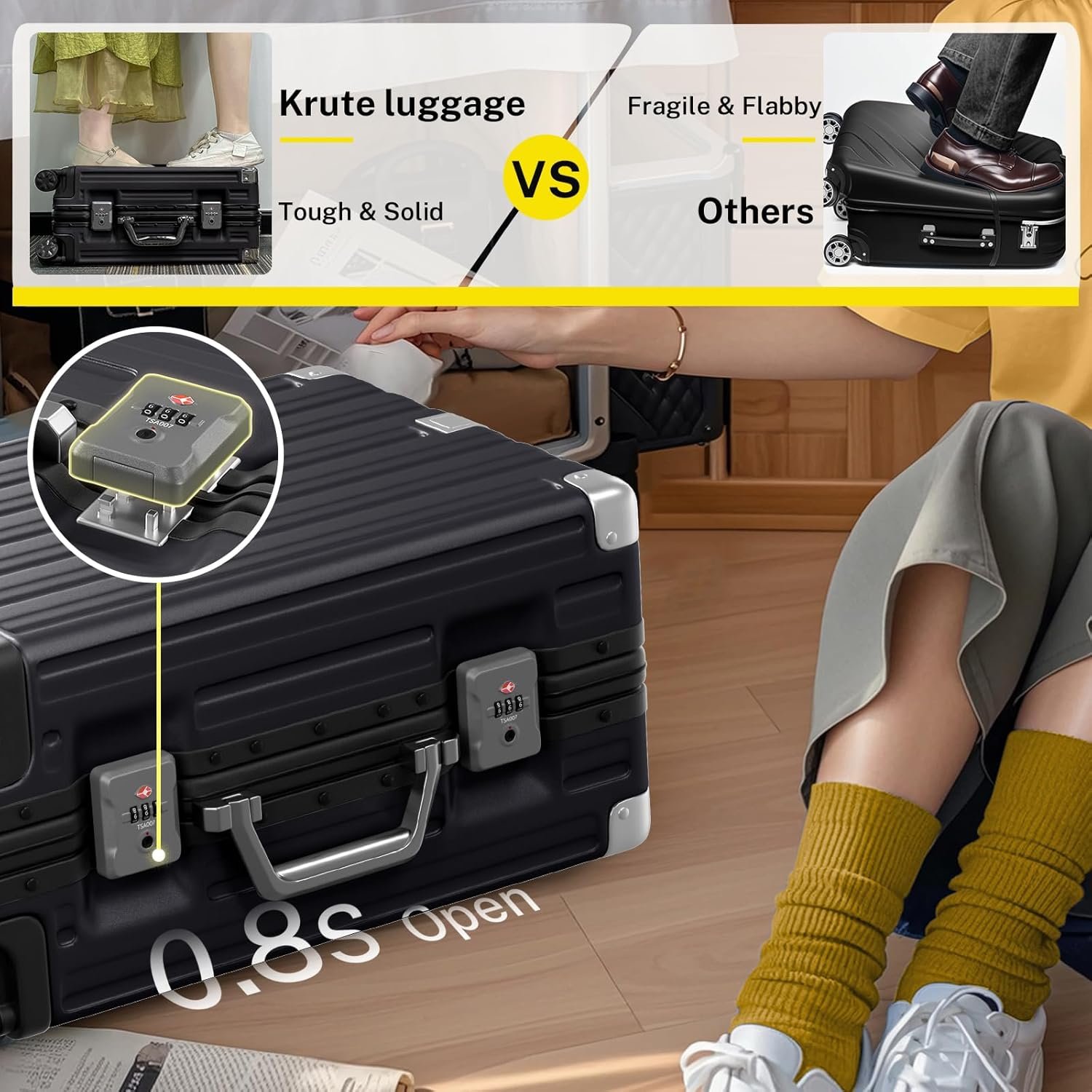 【TSA Lock for Security】The suitcase has a sturdy TSA lock (no keys) to boost luggage security during travel. Its zipperless design safeguards belongings from unauthorized access and enables TSA agents to inspect without damage. In noisy environments, this design lets you easily open the suitcase to find items, unlike a zip suitcase that requires going around the whole case