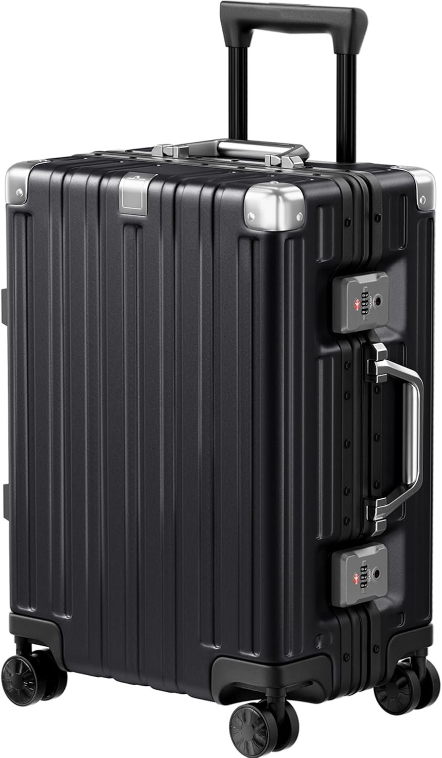 Krute Carry On Luggage Aluminum Frame No Zipper Metal Hardshell PC+ABS Luggage Noble TSA Airline Approved Suitcase with Spinner Wheels 20 Inch Black