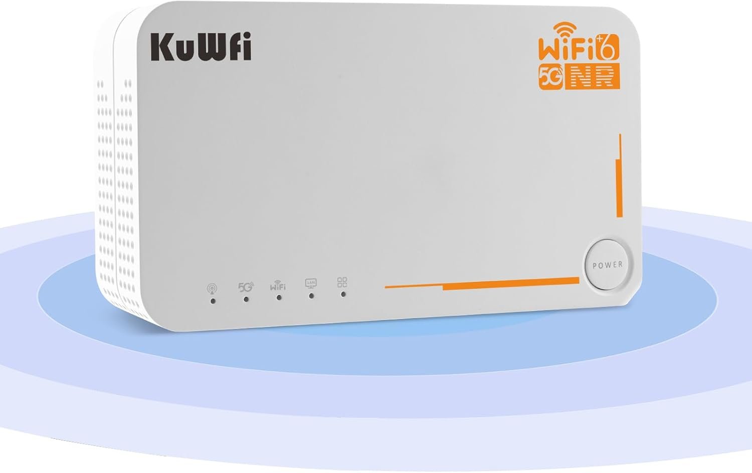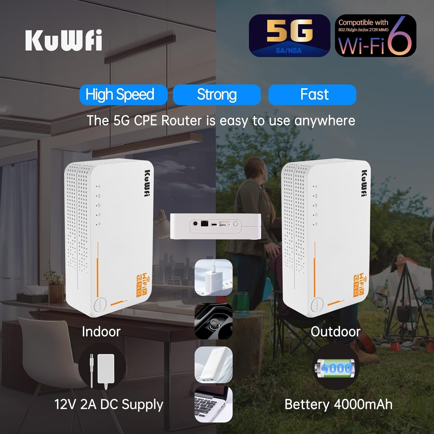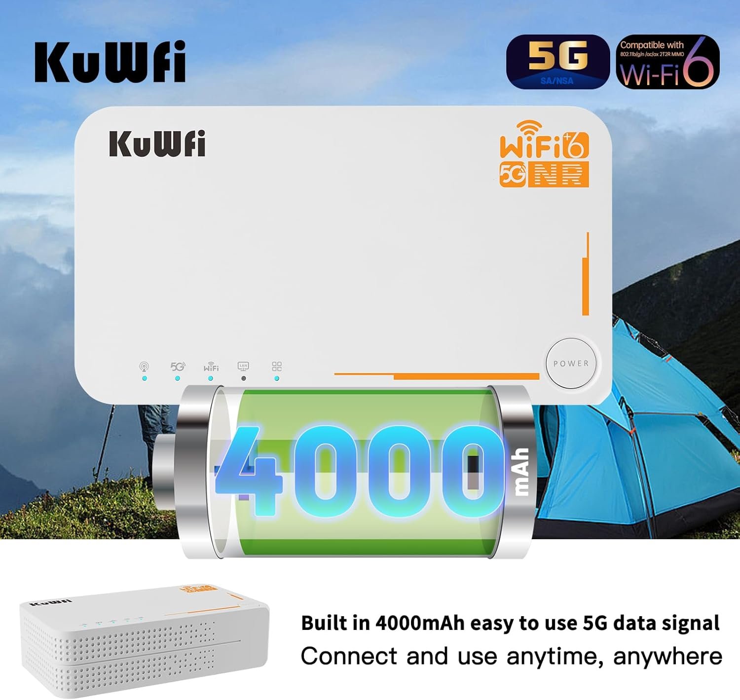 KuWFi 5G Router with Sim Card Slot, Unlocked, AX3600 Wireless 5G Wi-Fi 6 Mobile Hotspot, Dual Band, Gigabit, Portable, 4000mAh Battery & DC Powered