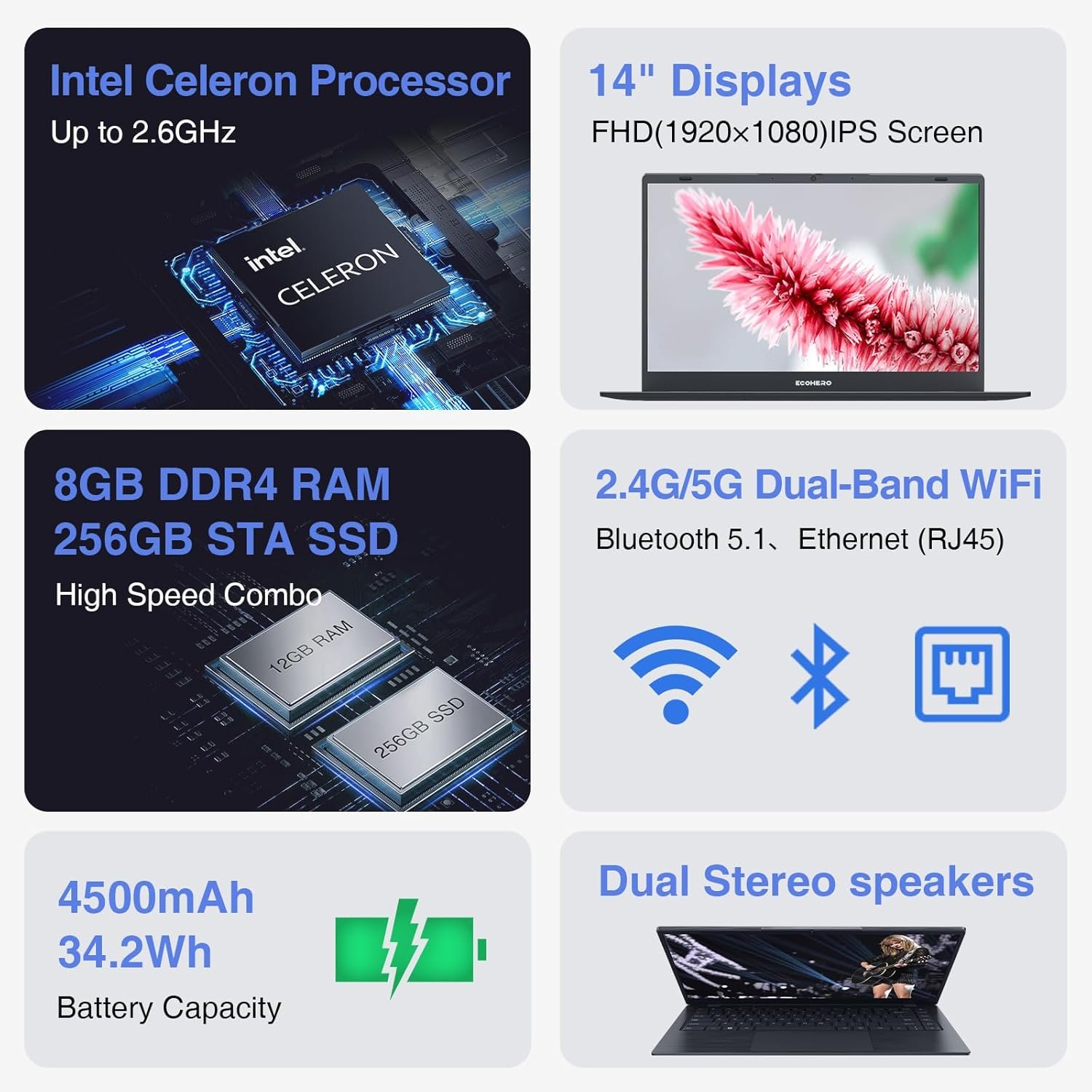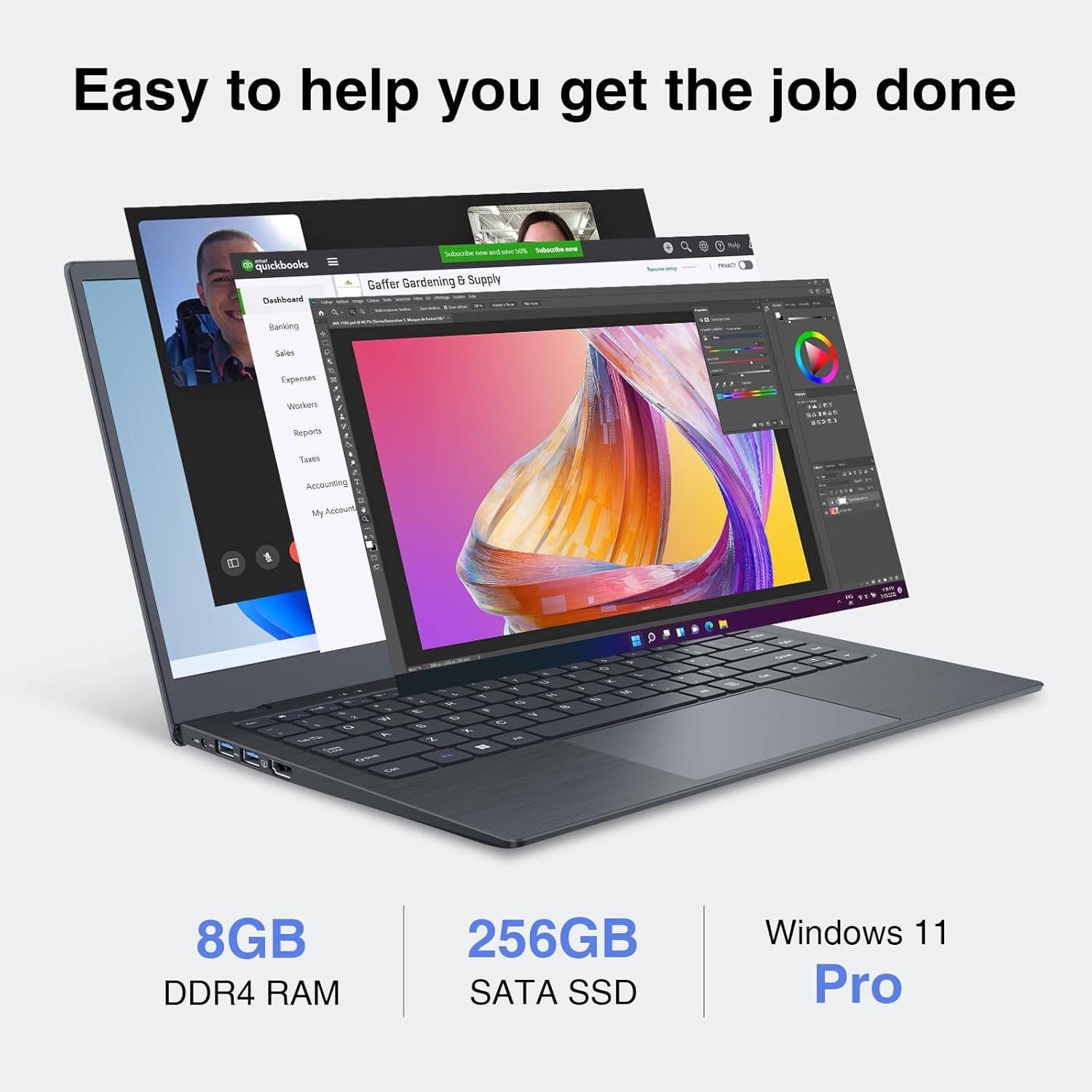 Laptop Computer, 8GB DDR4 RAM/256GB SSD, Celeron J4005 Processor, 14 Inch FHD Display, Win 11 Thin & Portable Notebook PC, 2.4G/5G WiFi and Bluetooth 5.1