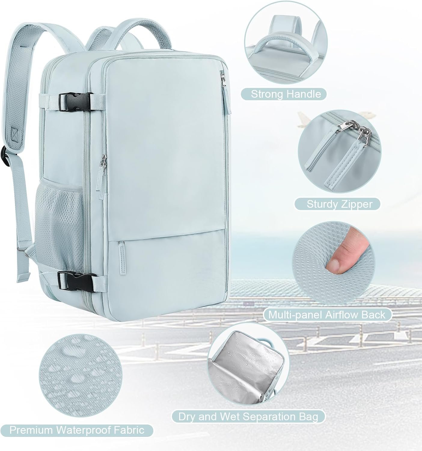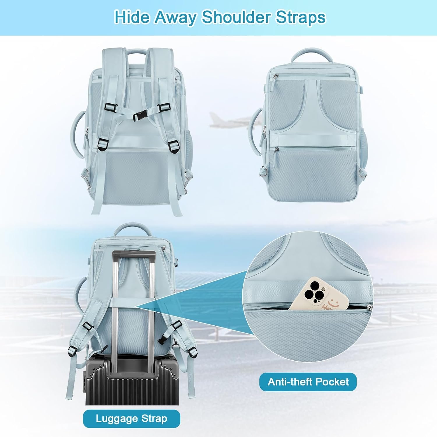 WITH LUGGAGE BELT & ANTI-THEFT POCKET: Featuring the luggage belt on its back, business traveler could fit backpack right on the luggage suitcase, easier carrying. A hidden anti-theft pocket located on the lower back protects your valuable items, such as wallet, passport, ID card from thieves when traveling or lining up.