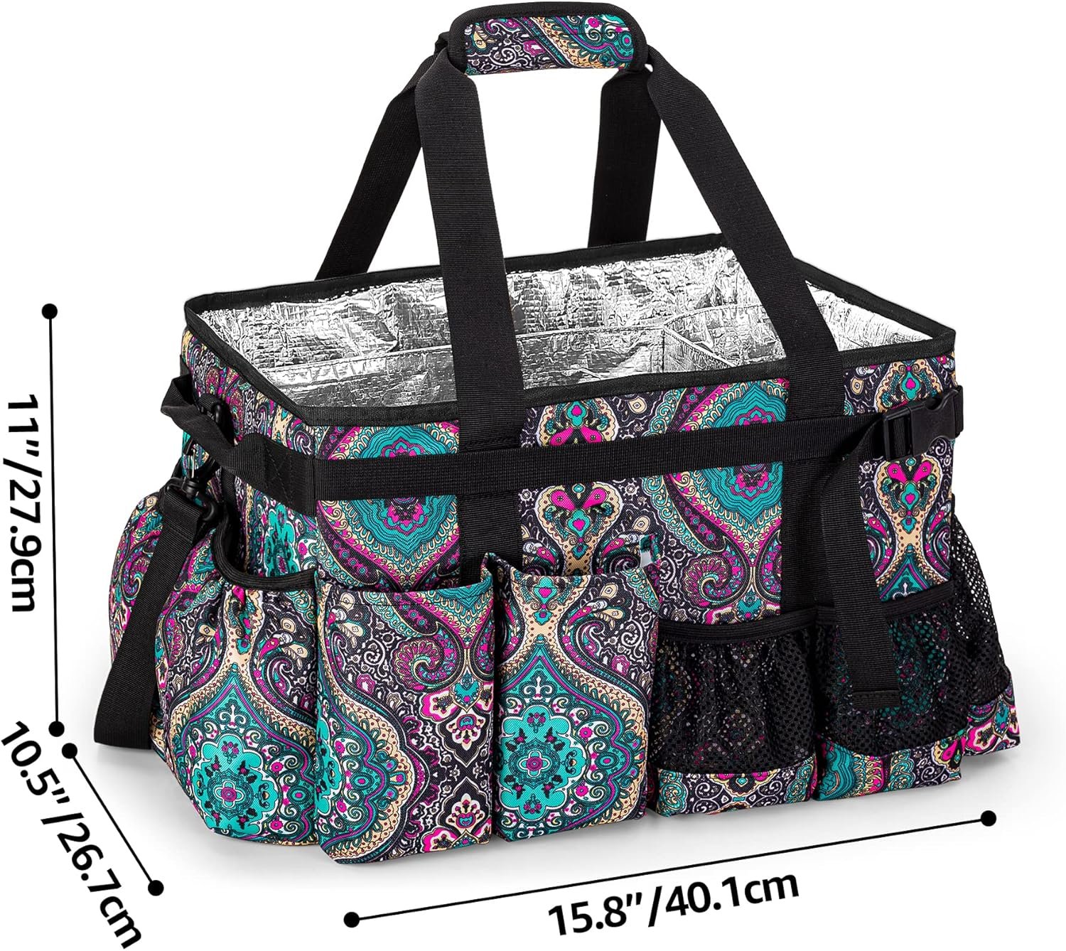 Interior Aluminum Coated: Main compartment without lid is aluminum coated for easy wipe and cleaning; non-removable dividers and 2 mesh pocket separate the inside to organize the picnic food, drinks, tableware, condiments and tools in an orderly manner
