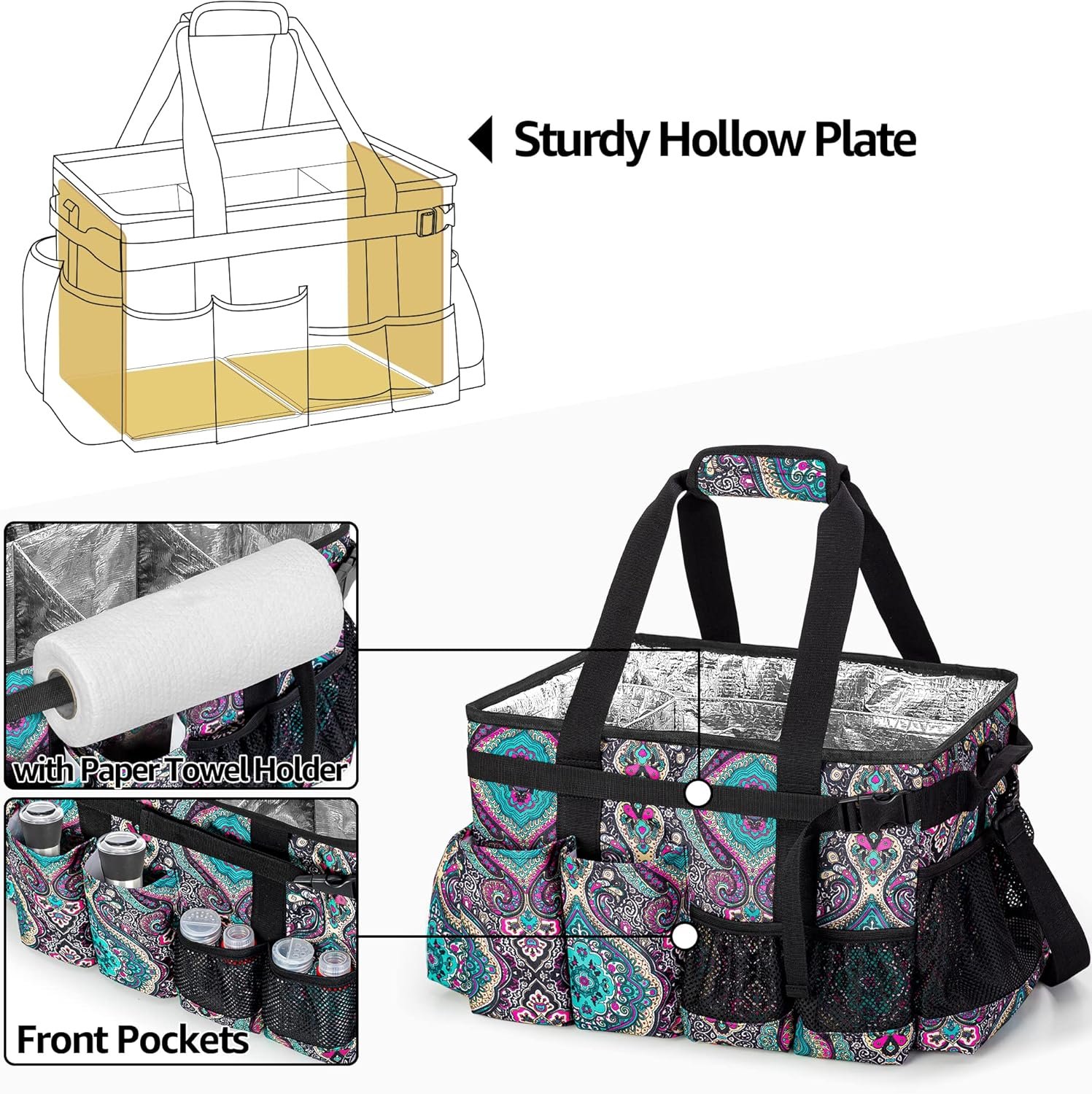 Sturdy Hollow Plate: With a foldable sturdy hollow plate on the bottom; there are also hollow plate on both sides to increase the load-bearing capacity of grill tools bag; the paper towel holder is practical when cooking or camping outdoors