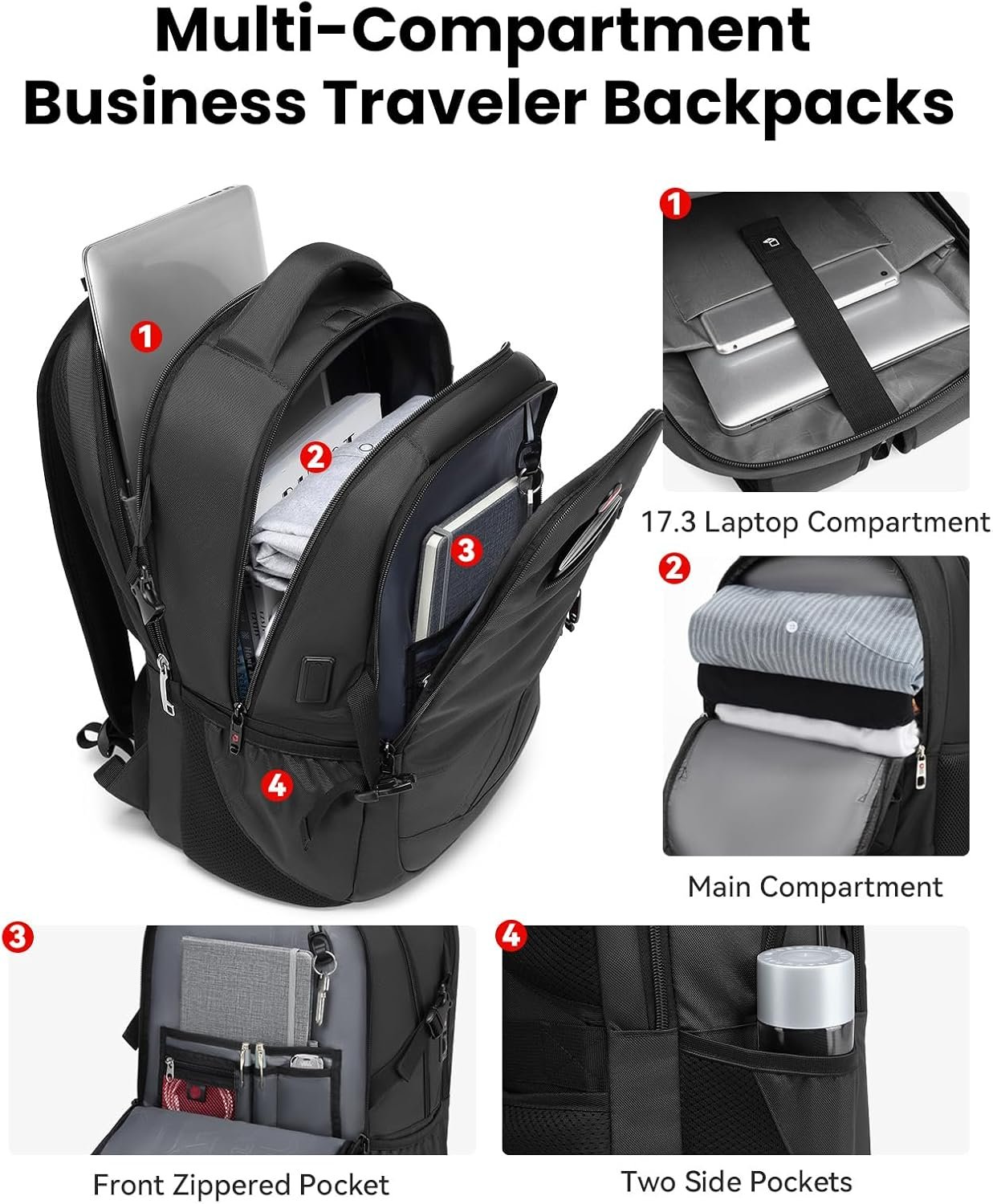 Large Capacity with Multiple Compartments and Pockets: Men travel laptop backpack with more than 10 independent pockets for large storage and organization for small items. Backpack for school have 4 spacious main multi compartments with many hidden pockets can accommodate lots of stuffs like travel accessories, clothes, notebook, pen pockets and key fob hook, 2 sides pockets holds a 32oz water bottle and umbrella pretty well make your items organized. Ideal laptop backpack for men and women.