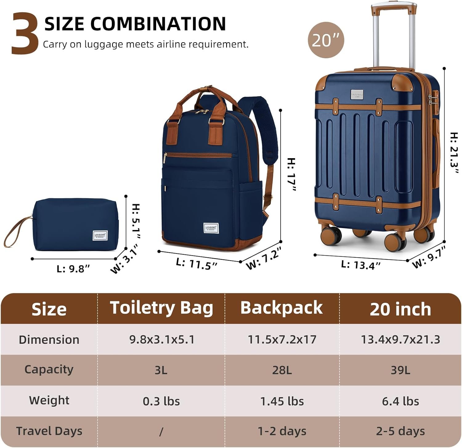 Expandable Carry on Luggage with Backpack: 3-piece set includes 20inch expandable carry on luggage 22x14x9 airline approved (Expands for extra 25% packing capacity), a travel backpack and a toiletry bag. The suitcase meets most American International Airlines’ carry-on luggage size requirements