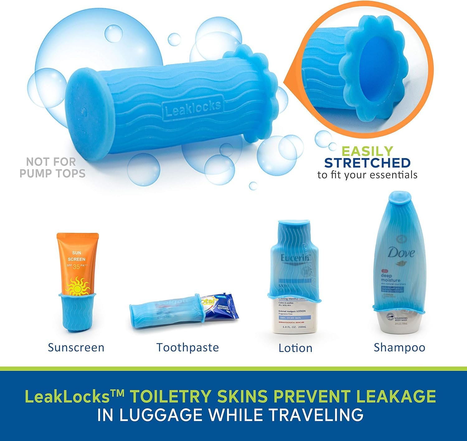 LeakLocks® Toiletry Skins™ Elastic Sleeve for Leak Proofing Travel Container in Luggage. For Standard and Travel Sized Toiletries. Reusable Accessory for Travel Bag Suitcase and Carry-on Luggage