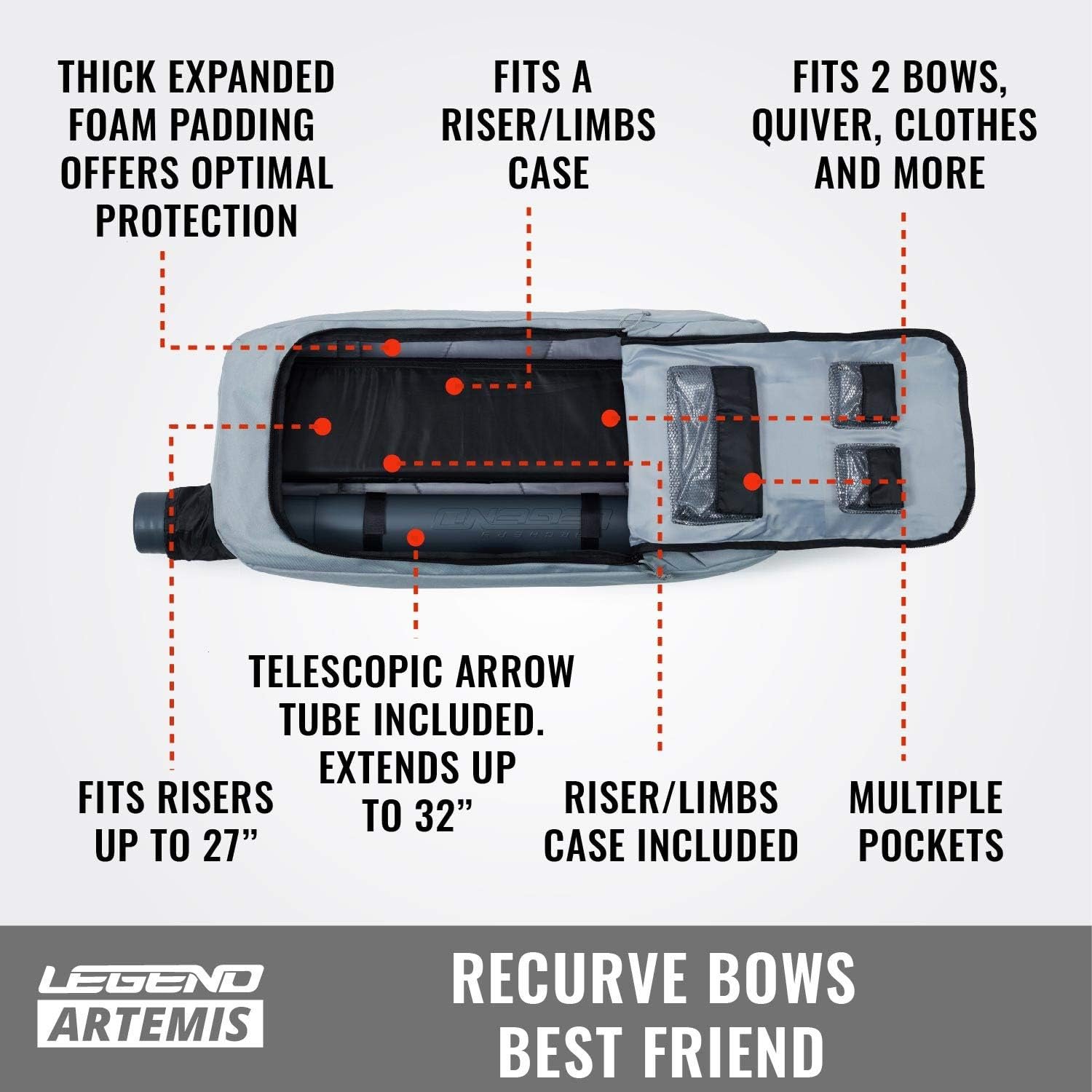 STORAGE; With plenty of pockets for your archery accessories, the LEGEND Artemis recurve bag neatly fits everything you need in one place; It can even fit the included telescopic arrow case that extends up to 32 inches, as well as risers up to 27”