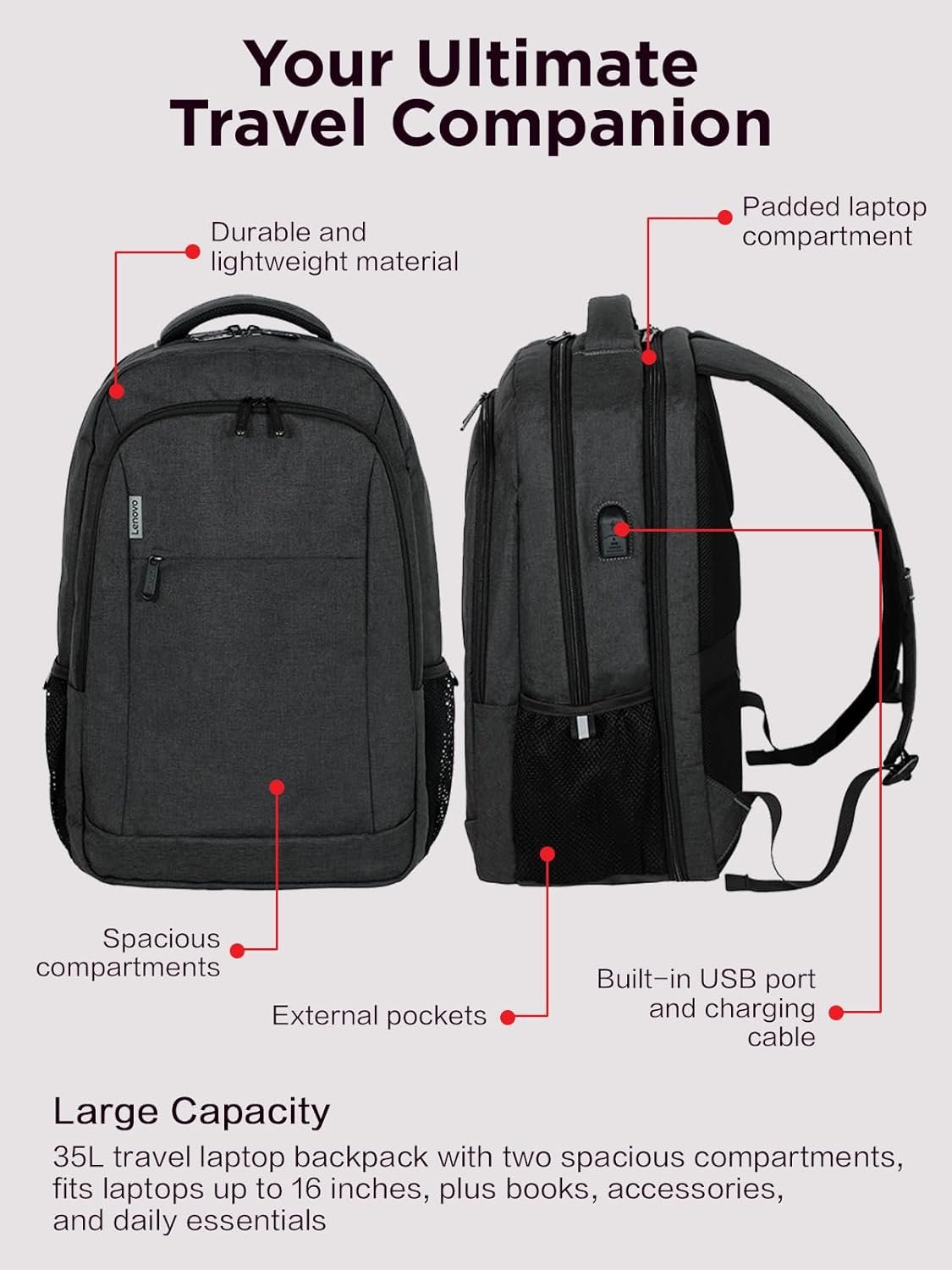 Lenovo B325 Laptop Backpack, 35L, Anti-Theft Travel Backpack, External USB Port, Water-Resistant, Luggage Strap, Fits 16-Inch Laptops, Durable Work & Commute Bag for Men & Women, Gifts for Travelers