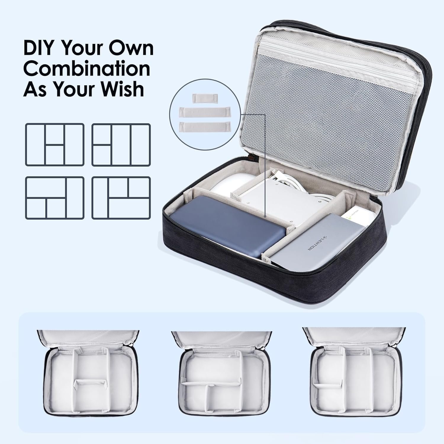 DIY & Double Layer Design – The electronics storage bag has 2 layers interior compartment. The organizer bag has multiple built-In removable magic sticks padded dividers, Design how much space for each sector as you want. With a large zipper mesh pockets suitable for tablet(up to 11 inch)