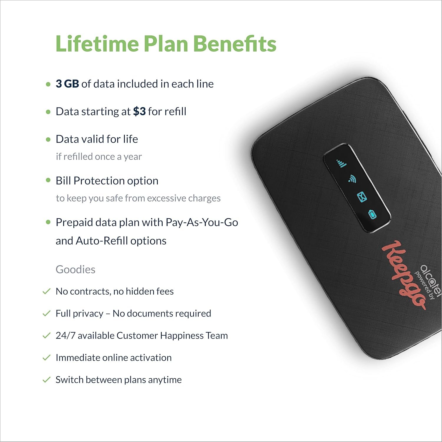 Mobile HotspotKeepgo Lifetime Prepaid Data Sim CardRechargeable Li batteryMicro USB cableActivation user guide