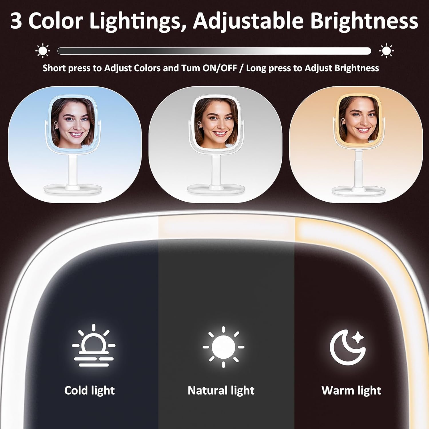 Lighted Makeup Mirror, Height Adjustable 1x/7x Magnifying Vanity Mirror, 2600mAh Rechargeable Makeup Mirror with Lights 3 Color, Double Sided 360° Rotation Desk Travel Mirror, Gifts for Women