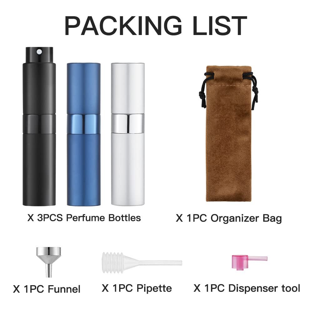 【FEATURES】Pack of 3, 8ml atomizer spray bottles are used to dispense perfume, cologne, and cosmetics when traveling or going out. The sprayer is refillable and portable, with no drips or leaks. The color is 3 black, sliver, blue