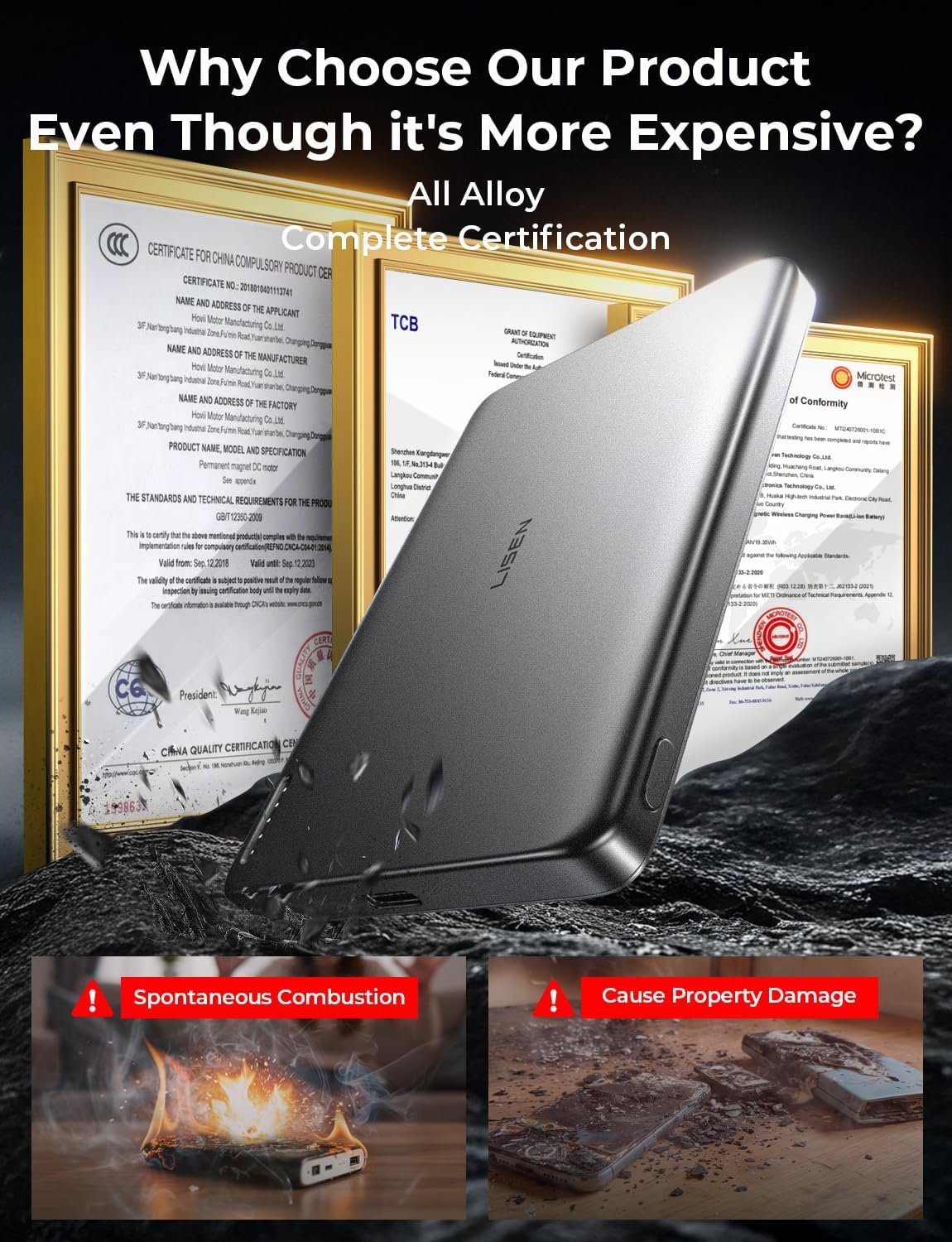 Ultra-Thin & Portable&High Quality: LISEN magnetic power bank is just 0.3 inches thick, thinner than an iPhone 15, offering mobile freedom without bulk. Keep your devices fully charged without being encumbered.LISEN Ultra Slim Power Bank has FCC, UL, TUV, DOE, CEC, UN, RoHS certifications to ensure the safety of use, and can be freely imported into and exported from Europe and the United States
