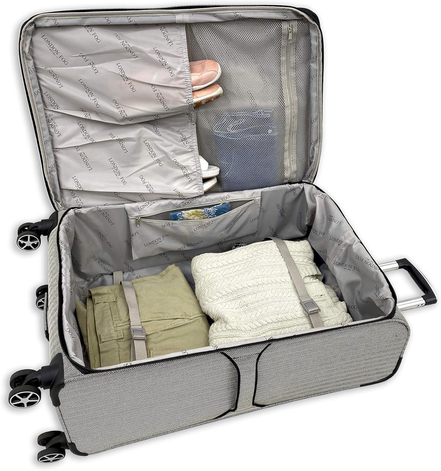 8-low profile 360 degree multi-directional wheels. Full color contrasting London Fog signature lining.