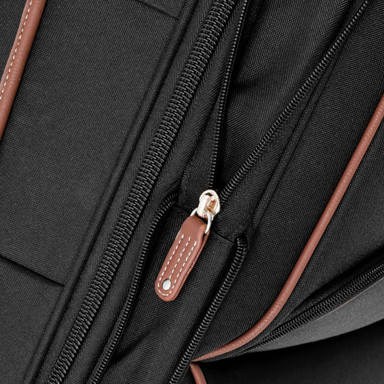 High density woven material with faux leather trim Hyperlight chassis with grid base for superior strength Trolley has aluminum channel tubes for added strength