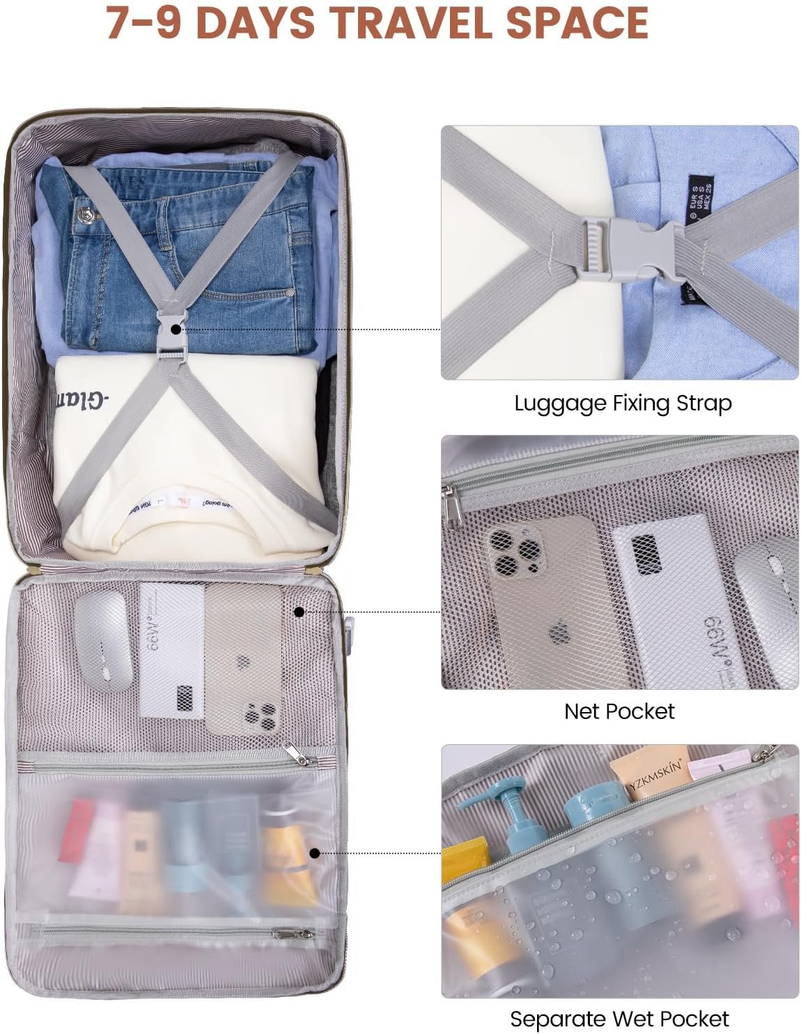 【3 Extra Packing Cubes & Wet Pockets】This carry-on bag includes 3 extra packing cubes – 2 storage bags and a shoe bag – as well as a built-in wet compartment pocket. Perfect for storing wet clothes, towels, and toiletries, these packing accessories ensure your belongings remain dry and prevent any leaks or moisture from affecting your other items.