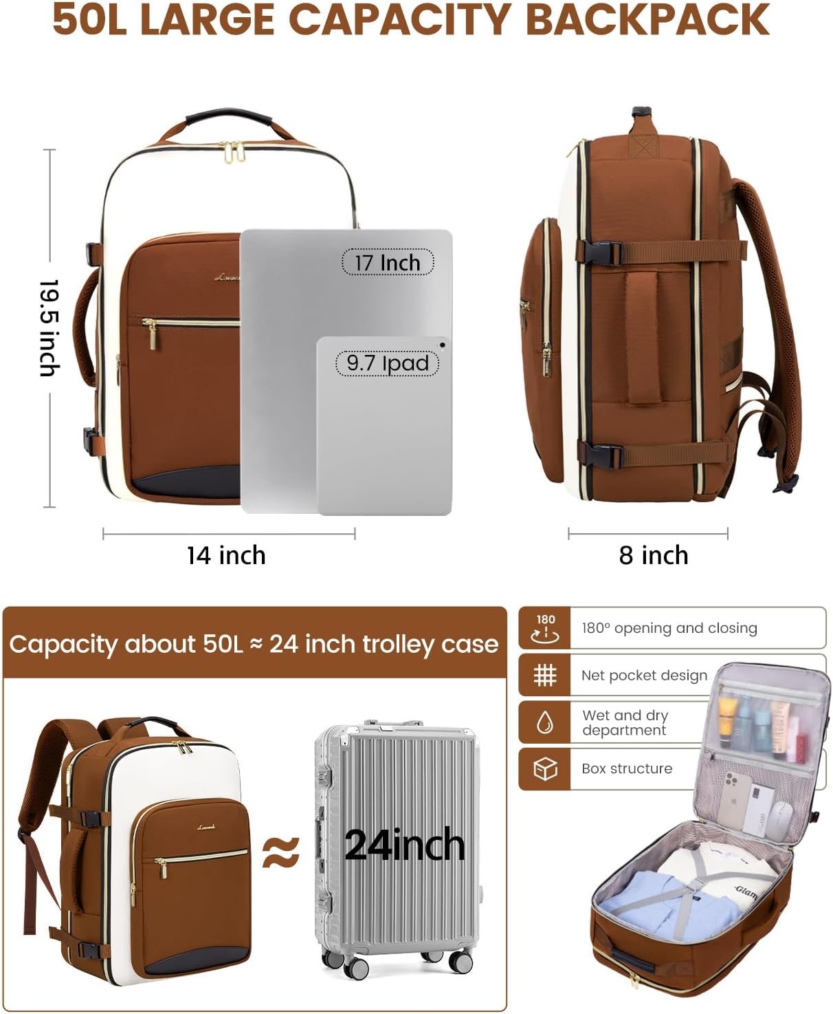 【Versatile & Airline Approved】Measuring 19.5*14*8 inches, this carry on backpack fits under the seat or in the overhead compartment, approved by Spirit, Frontier, JetBlue, and other budget-friendly airlines, making it the perfect personal item for air travel.