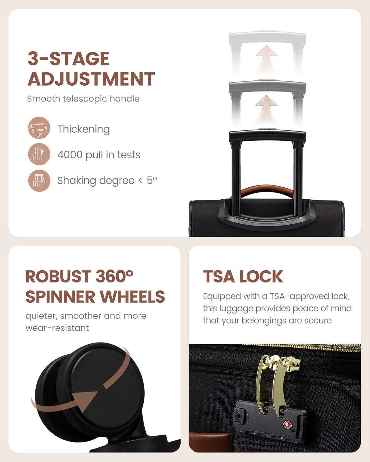 【Secure, Durable, Sturdy】Our carry on features a TSA-approved lock for safety. Carry on luggage crafted from premium durable polyester fabric that resists stains and abrasions. The wheeled suitcase features high-quality and durable zippers, ensuring long-lasting performance and reliability.