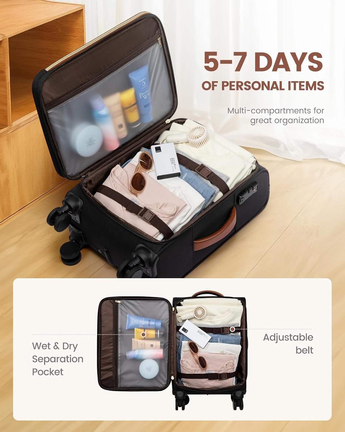 【Spacious & Organized】LOVEVOOK carry on suitcase offers ample storage and compartments for easy organization and access. A spacious main compartment with adjustable straps for clothes/shoes. A dedicated waterproof wet pocket for wet clothes or toiletries. Ideal for overnight trips, so you’re always ready for a quick getaway.
