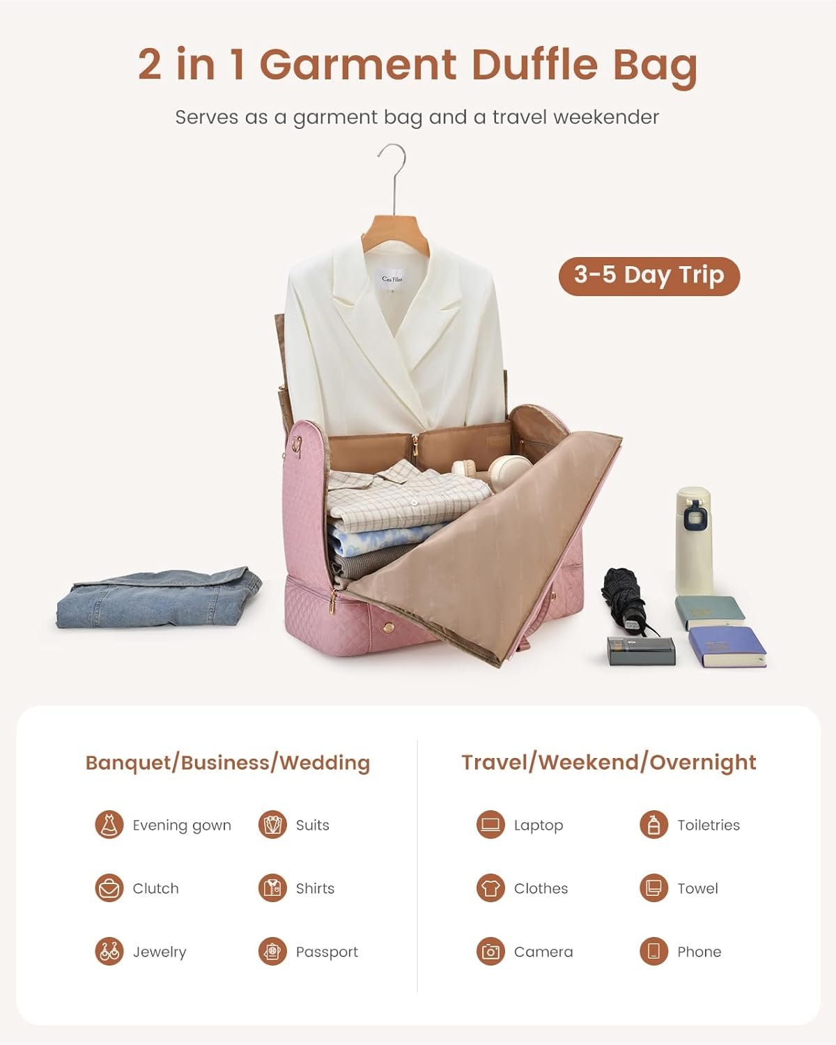 【Keep Clothes Wrinkle-free】This travel garment bag doubles as both a hanging garment bag and a duffle bag,easily keeping your suit or dress wrinkle-free during business trips, wedding or travel. Additionally, it can be folded flat for space-saving.