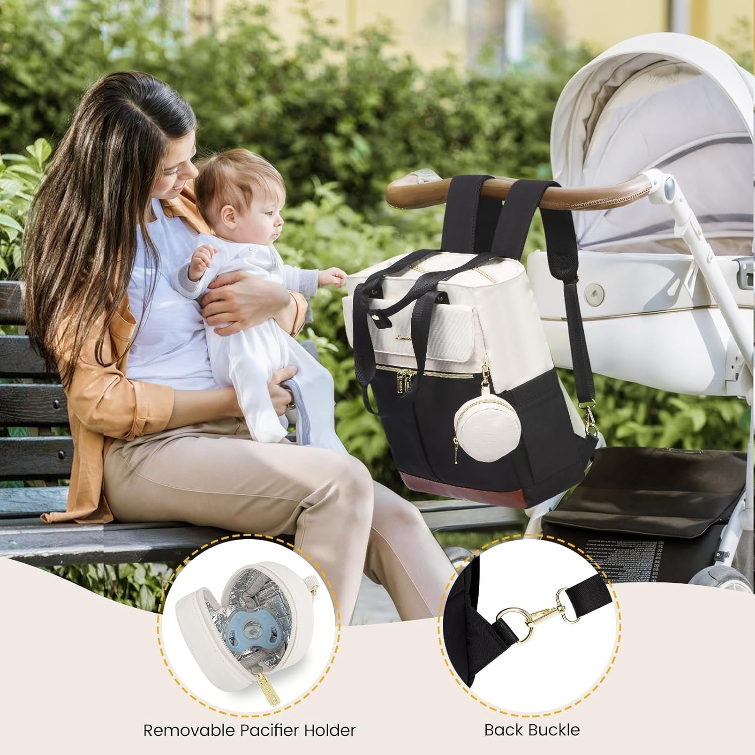 6-in-1 Multifunctional Diaper Bag: All-in-one design includes an insulated bottle pocket, pacifier case, washable changing pad, built-in stroller strap, anti-theft pocket, and luggage strap. Versatile design keeps all essentials neat and tidy. With its stylish appearance, it can be used for a long time even after the nappy changing phase.at and tidy. With its stylish appearance, it can be used for a long time even after the nappy changing phase.