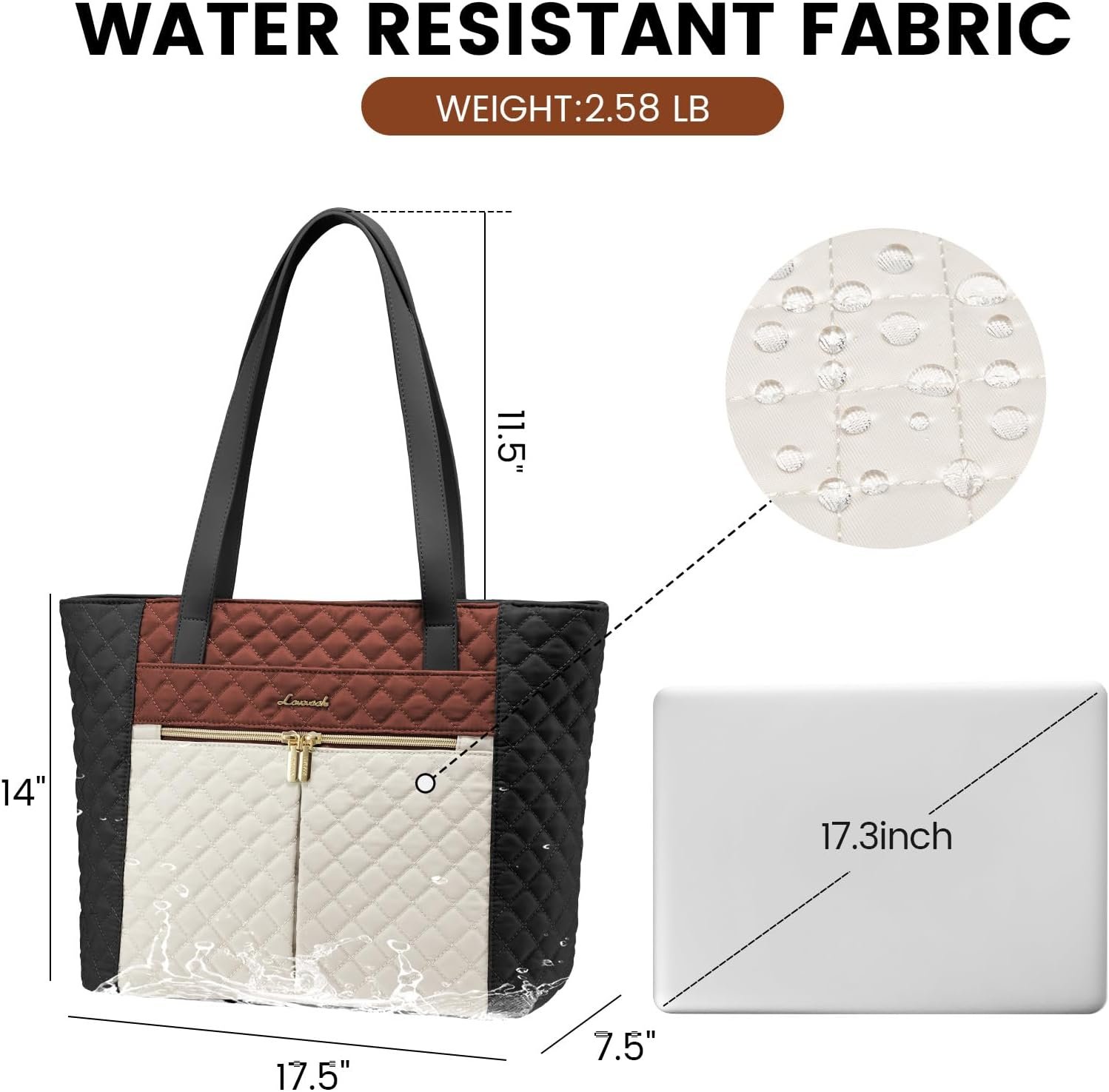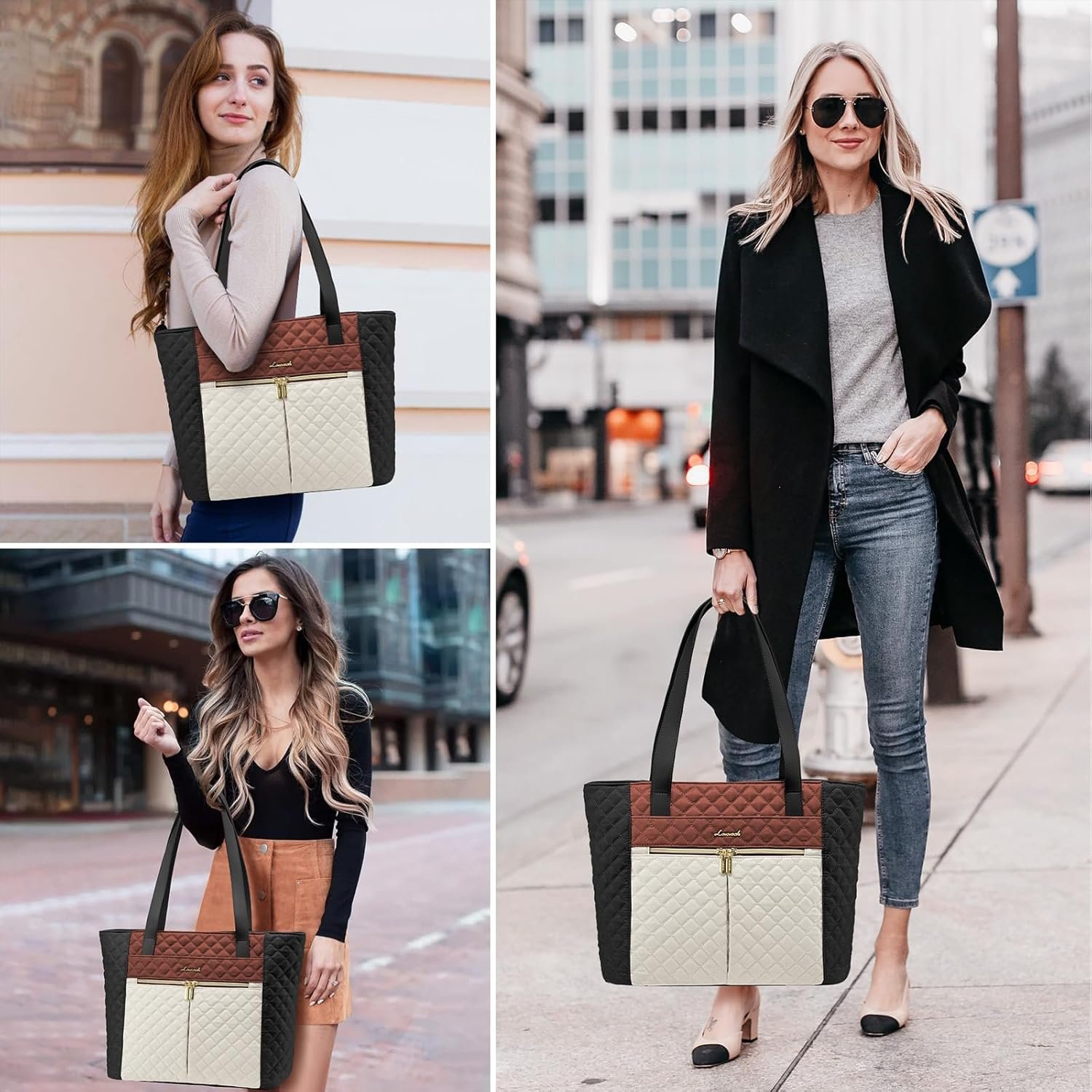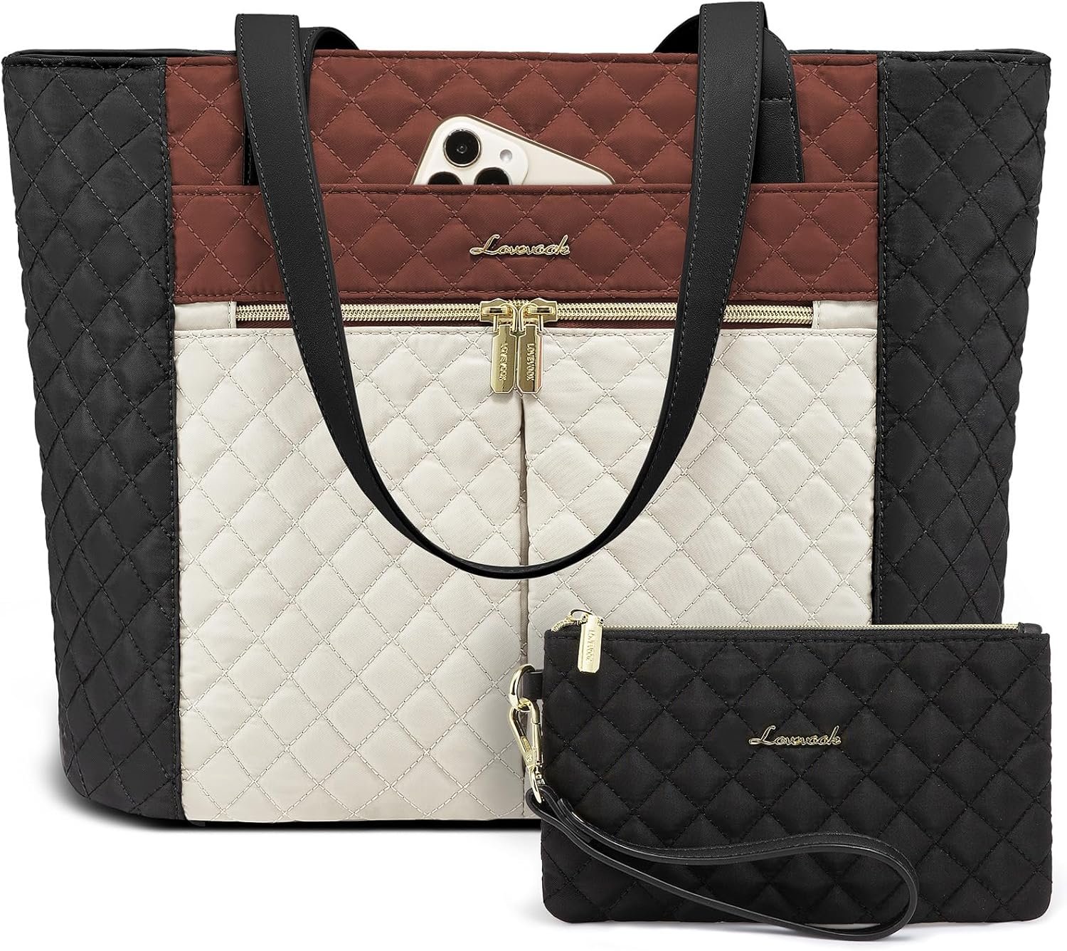 LOVEVOOK Laptop Bag for Women 17 inch,Diamond Quilted Work Tote Bags Womens Laptop Computer Shoulder Bags,Stylish Travel Tote Bags Laptop Purse Briefcase Handbag with Clutch Purse,Brown-Black-White
