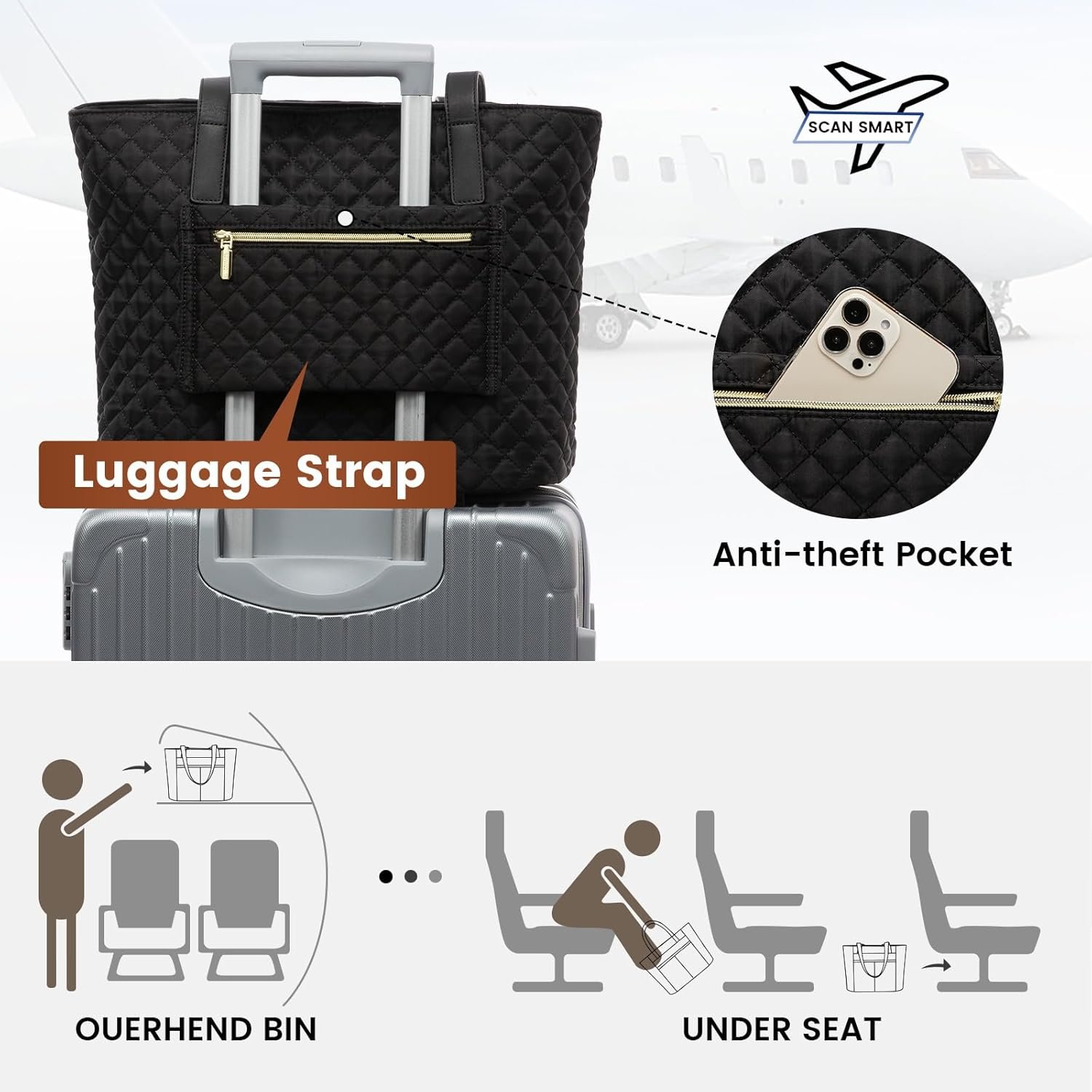【Great Travel Tote Bags for Women】 A luggage strap allows the tote purse fit on luggage/suitcase, slide over the luggage upright handle tube for easier carrying. With a anti theft pocket on the luggage strap protect your valuable items from thieves.