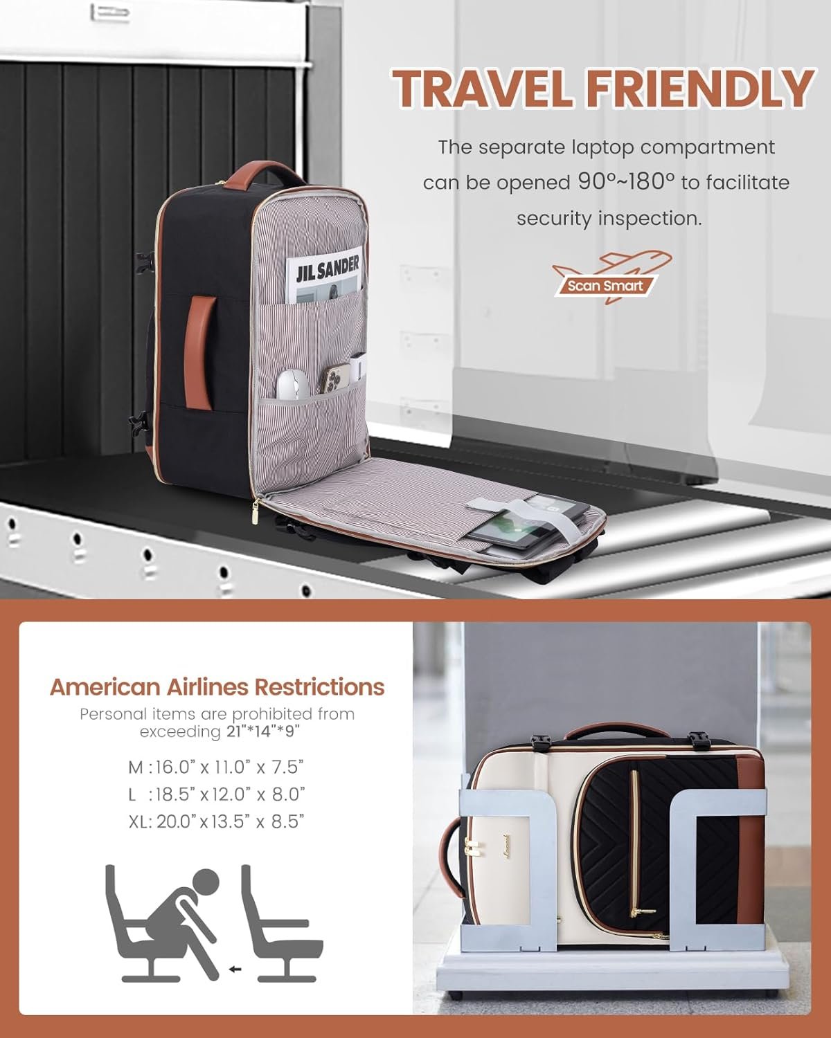 【AIRLINE APPROVED & TSA FRIENDLY】: This 18.5x12x8 inch carry on bags for airplanes is perfect for budget-friendly airlines like Spirit, Frontier, Easy Jet, Jet Blue, and more, fitting into overhead compartments and under seats. The separate laptop compartment can open 180° for easy security checks.